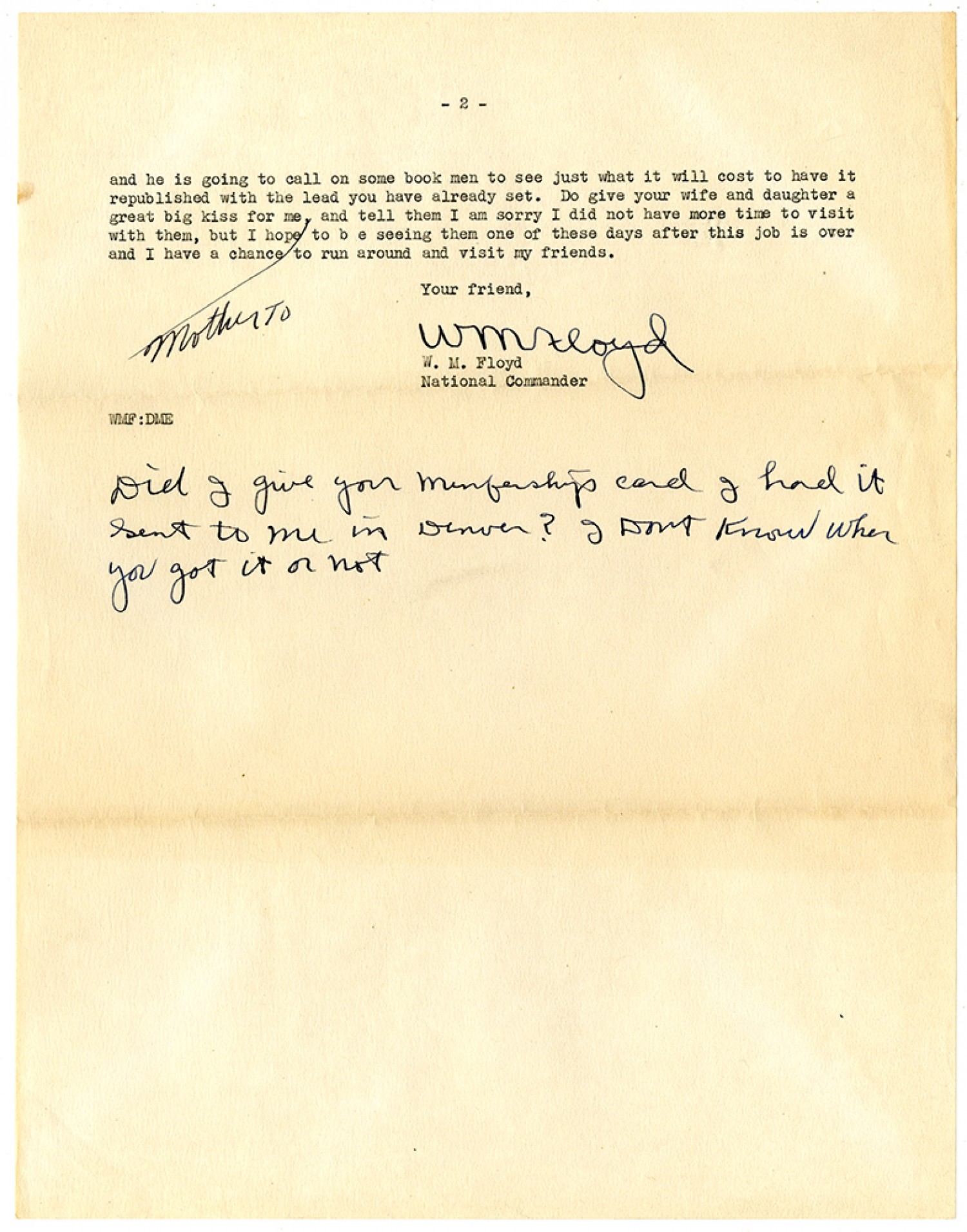 [page 2] and he is going to call one some book men to see just what it will cost to have it republished with the lead you have already set. Do give your wife and daughter a great big kiss for me, mother to and tell them I am sorry I did not have more time to visit with them, but I hope to be seeing them one of these days after this job is over and I have a chance to run around and visit my friends. Your friend, [signature] W.M. Floyd National Commander WMF:DME Did I give you membership card I had it sent to me in Denver? I dont know when you got it or not