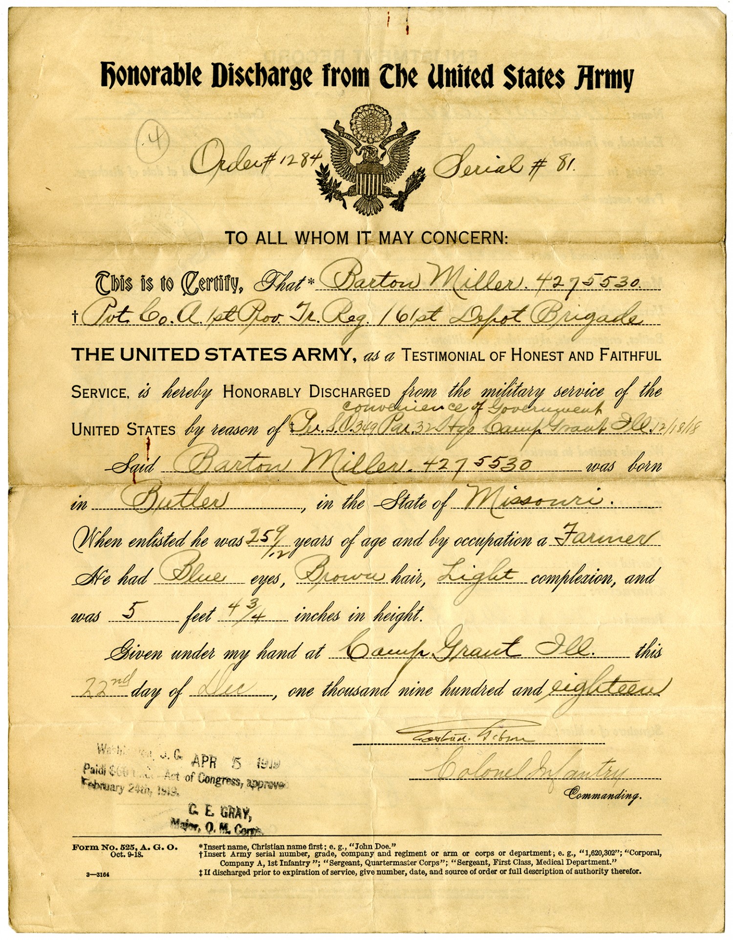 Honorable Discharge from The United States Army 4 Order #1284 Serial #81. TO ALL WHOM IT MAY CONCERN: This is to Certify, That * Barton Miller. 4275530. Pvt. Co. A 1st Prov. Tr. Reg. 161st Depot Brigade THE UNITED STATES ARMY, as a TESTIMONIAL OF HONEST AND FAITHFUL SERVICE is hereby HONORABLY DISCHARGED from the military service of the UNITED STATES by reason of convenience of Government On. S. O. 249 Par. 32 Hqs [Camp Grant, Illinois] [December 18, 1918] Said Barton Miller. 4275530 was born in Butler, in the States of Missouri. When enlisted he was 25 9/12 years of age and by occupation a Farmer He had Blue eyes, Brown hair, Light complexion, and was 5 feet 4