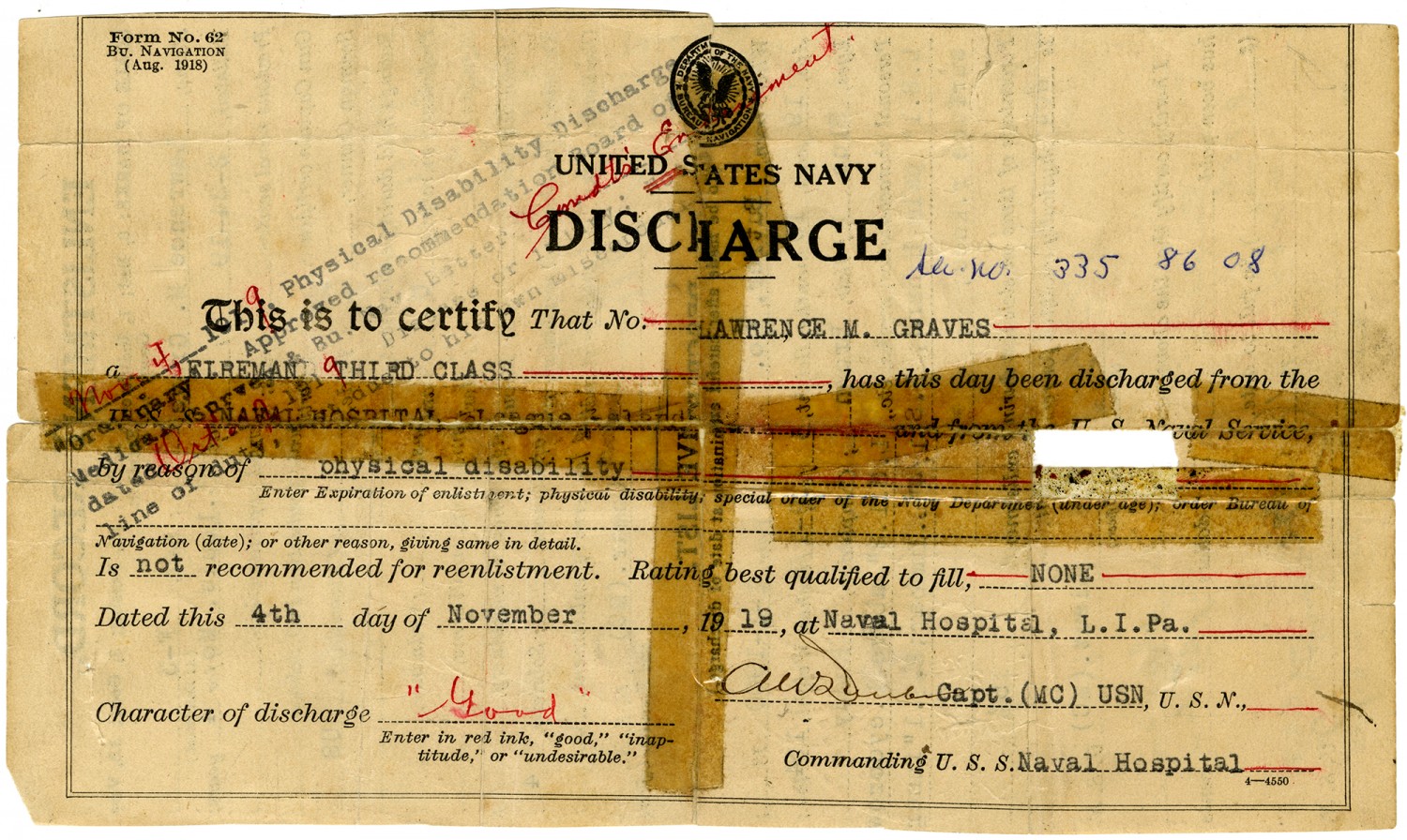 [stamp] [November 4, 1919] Physical Disability Discharge [ms illegible: remainder of stamp] UNITED STATES NAVY DISCHARGE Ser. No. 335 86 08 This is to certify That No. LAWRENCE M. GRAVES a FIREMAN THIRD CLASS, has this day been discharged from the [ms illegible: 1 wd] NAVAL HOSPITAL and from the [ms illegible: 1 wd] Naval Service, by reason of physical disability Enter Expiration of enlistment; physical disability; special order of the Navy Department (under age); order Bureau of Navigation (date); or other reason, giving same in detail. Is not recommended for reenlistment. Rating best qualified to fil, NONE Dated this 4th day of November, 1919, at Naval Hospital, [League Island, Pennsylvania] Character of discharge