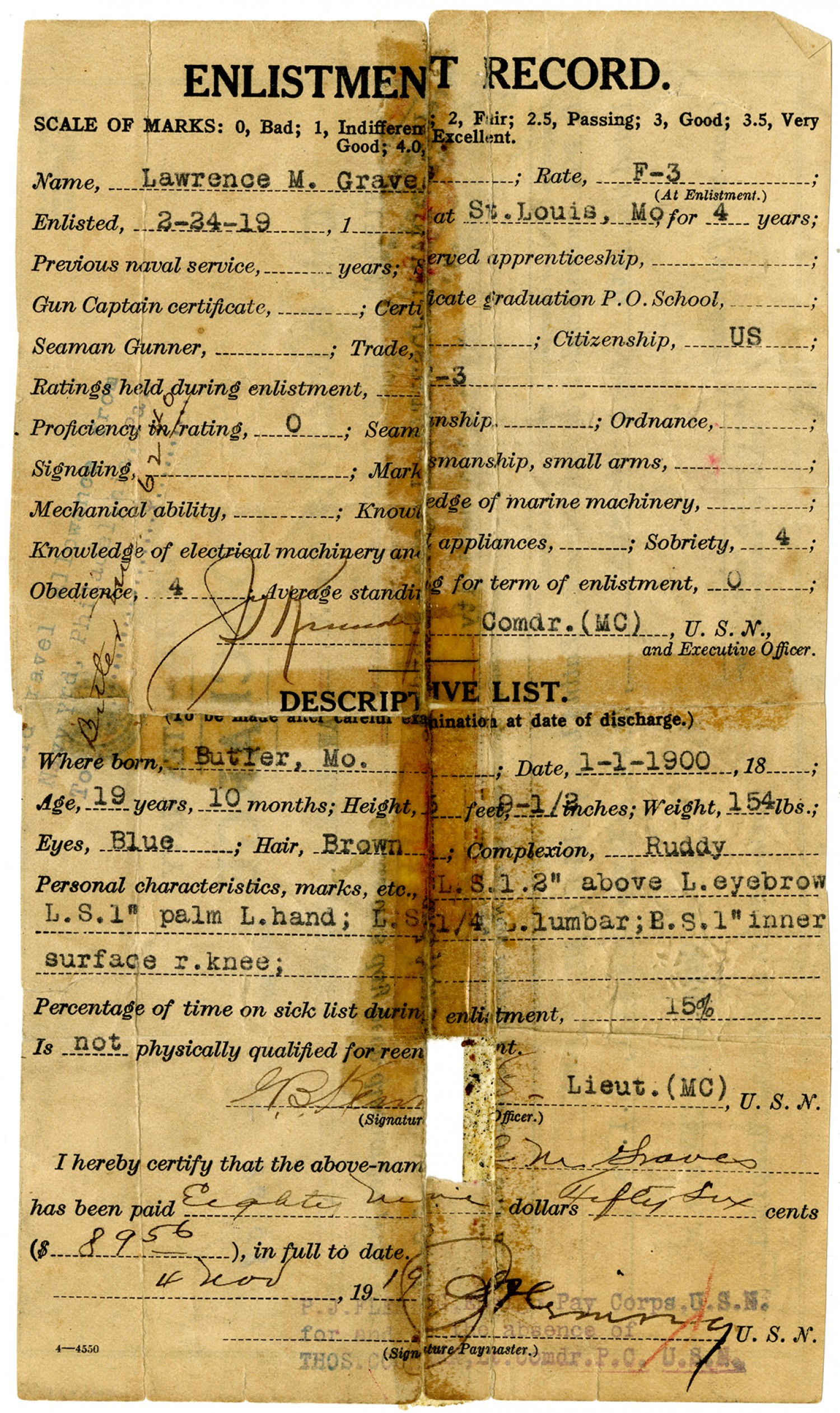 ENLISTMENT RECORD. SCALE OF MARKS: 0, Bad; 1, Indifferent; 2, Fair; 2.5, Passing; 3, Good; 3.5, Very Good; 4.0, Excellent. Name, Lawrence M. Graves; Rate, F-3; Enlisted, [February 24, 1919], 1 at [St. Louis, Missouri] for 4 years; Previous naval service, years; served apprenticeship, ; Gun Captain certificate,