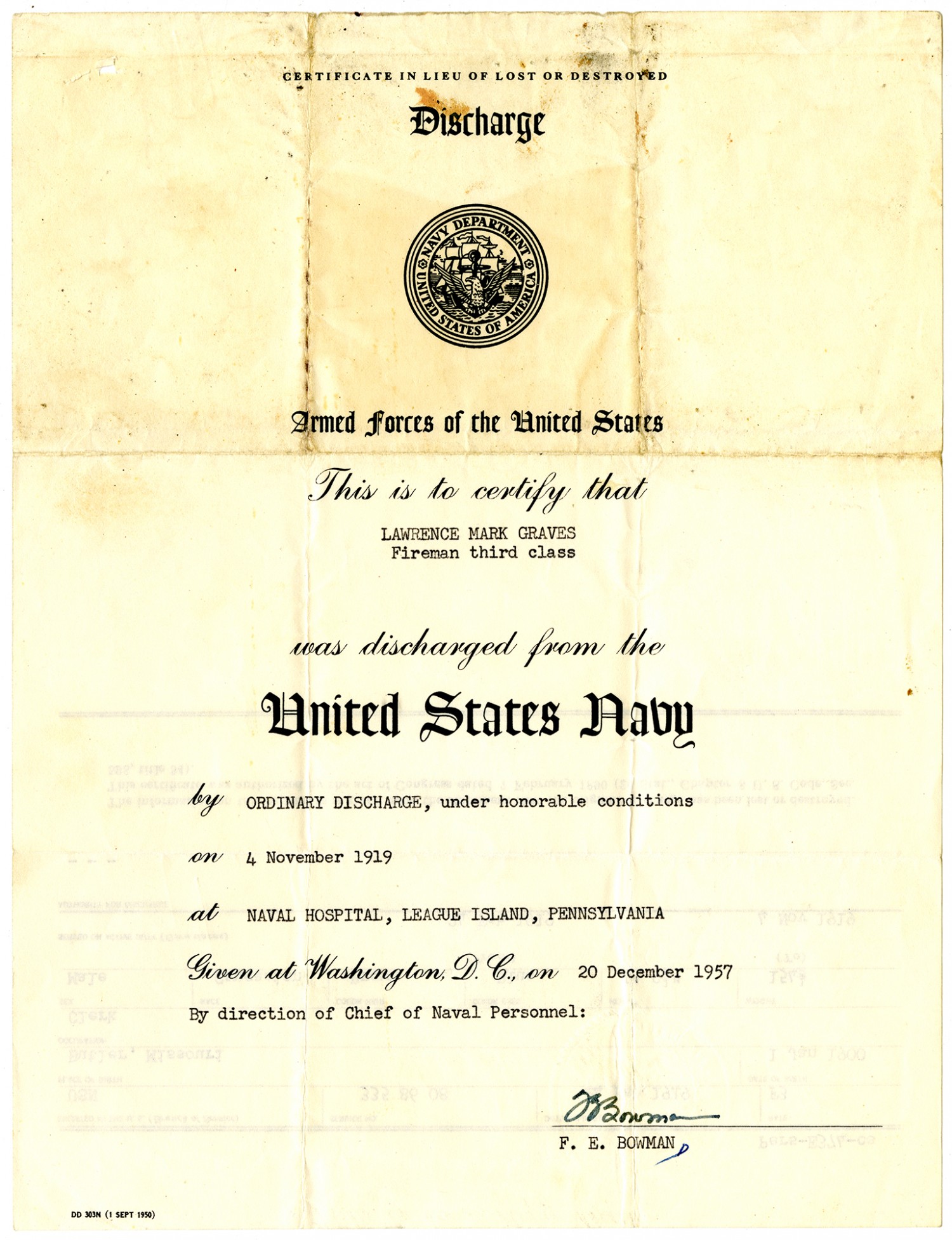 CERTIFICATE IN LIEU OF LOST OR DESTROYED Discharge Armed Forces of the United States This is to certify that LAWRENCE MARK GRAVES Fireman third class was discharged from the UNITED STATES NAVY by ORDINARY DISCHARGE, under honorable conditions on [November 4, 1919] at NAVAL HOSPITAL, LEAGUE ISLAND, PENNSYLVANIA Given at Washington, D. C., on [December 20, 1957] By direction of Chief of Naval Personnel: [signature] F. E. BOWMAN