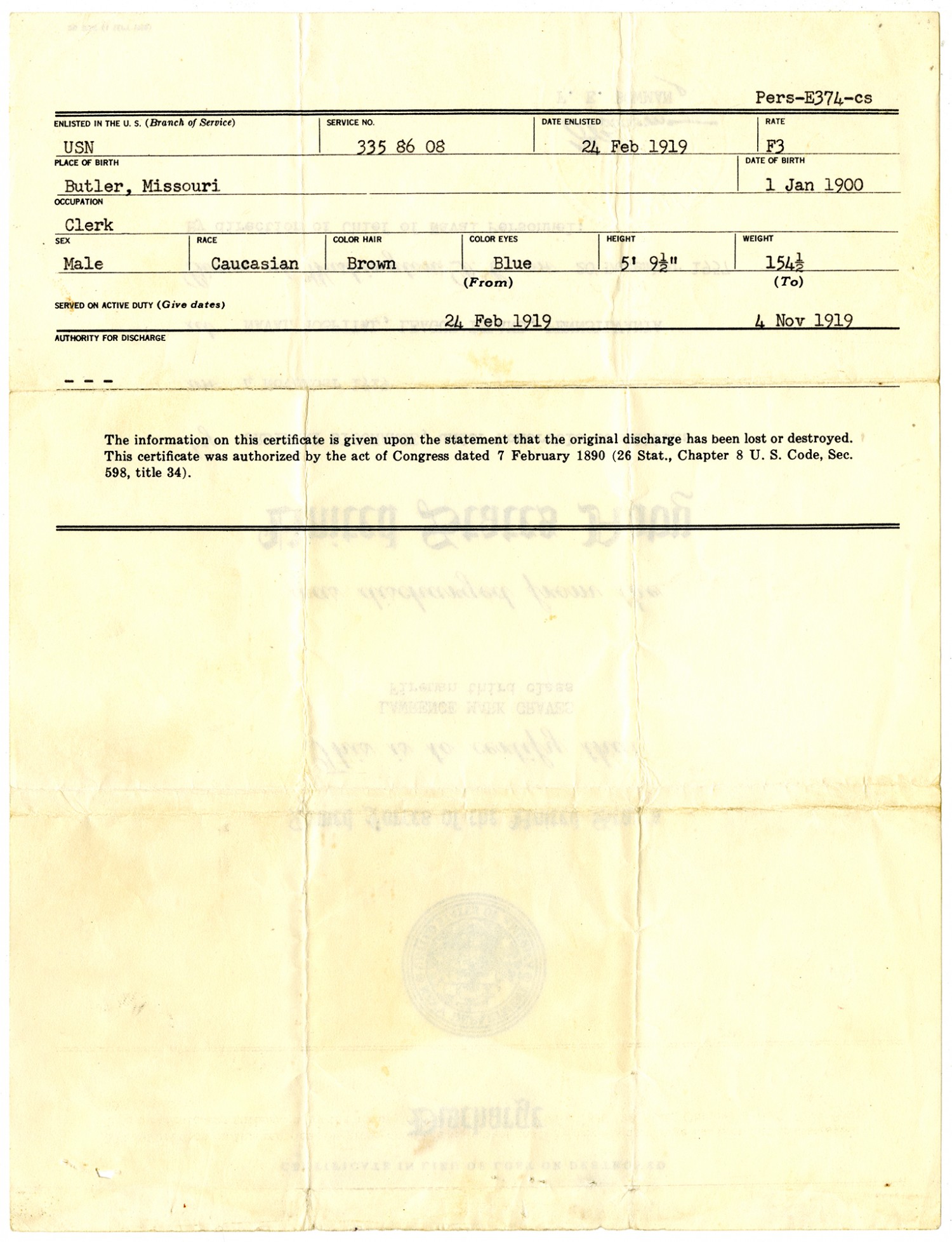 ENLISTED IN THE U. S. (Branch of Service) USN SERVICE NO. 335 86 08 DATE ENLISTED [February 24, 1919] RATE F3 PLACE OF BIRTH Butler, Missouri DATE OF BIRTH [January 1, 1900] OCCUPATION Clerk SEX Male RACE Caucasian COLOR HAIR Brown COLOR EYES Blue HEIGHT 5