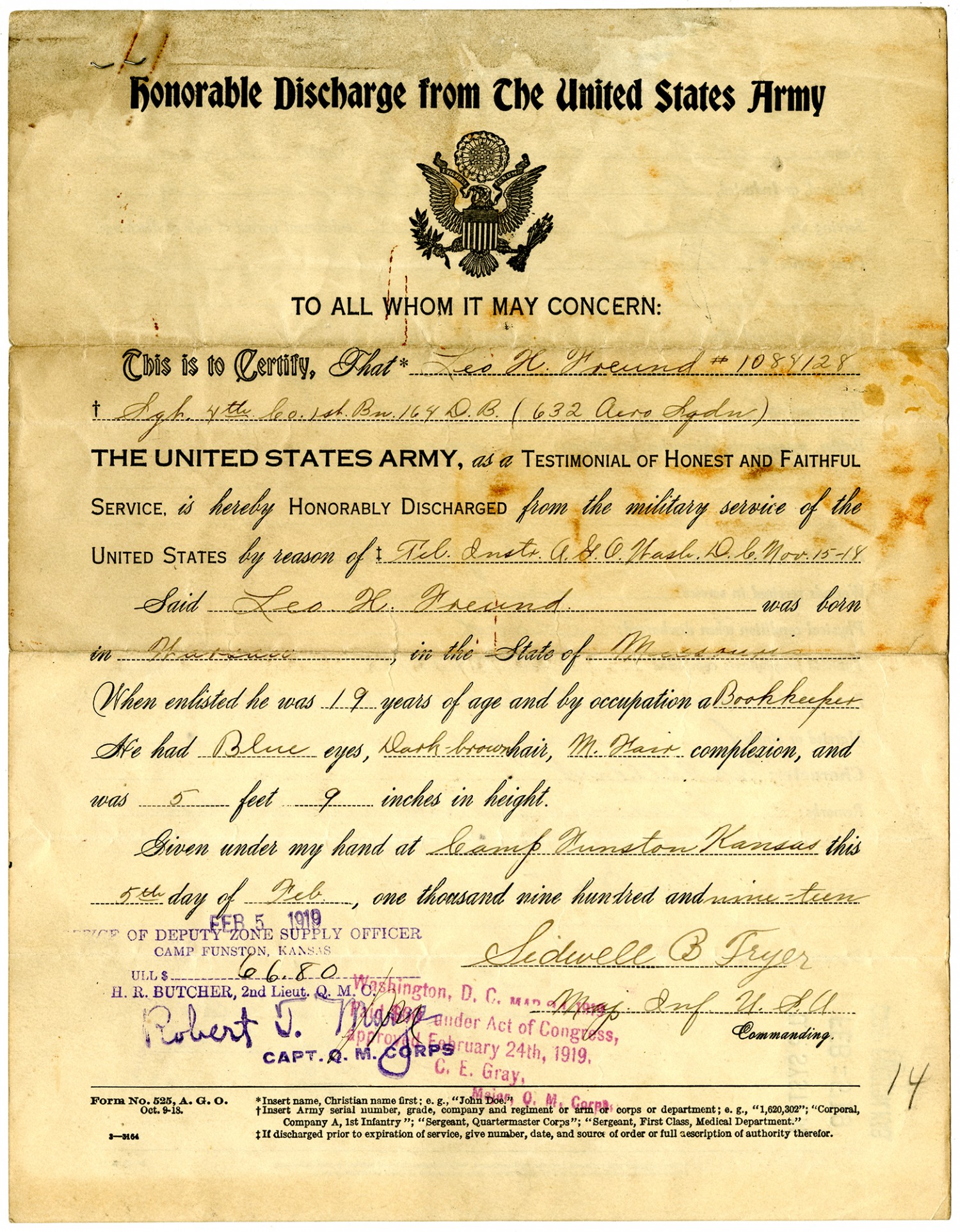 Honorable Discharge from The United States Army TO ALL WHOM IT MAY CONCERN: This is to Certify, That * Leo H. Freund #1084128 Sgt. 4th Co. 1st Bn. 164 D. B. (632 Aero Sqdn) THE UNITED STATES ARMY, as a TESTIMONIAL OF HONEST AND FAITHFUL SERVICE, is hereby HONORABLY DISCHARGED from the military service of the UNITED STATES by reason of Tel. Instru. A. G. O. [Washington, D. C.] [November 15, 1918] Said Leo H. Freund was born in Warsaw, in the State of Missouri When enlisted he was 19 years of age and by occupation a Bookkeeper He had Blue eyes, Dark-brown hair, M. Fair complexion, and was 5 feet 9 inches in height. Given under my hand at Camp Funston, Kansas this 5th day of [February], on thousand nine hundred and nine-teen [stamp, bottom margin] Sidewell B. Fryer Major. Inf. U. S. A. Commanding.
