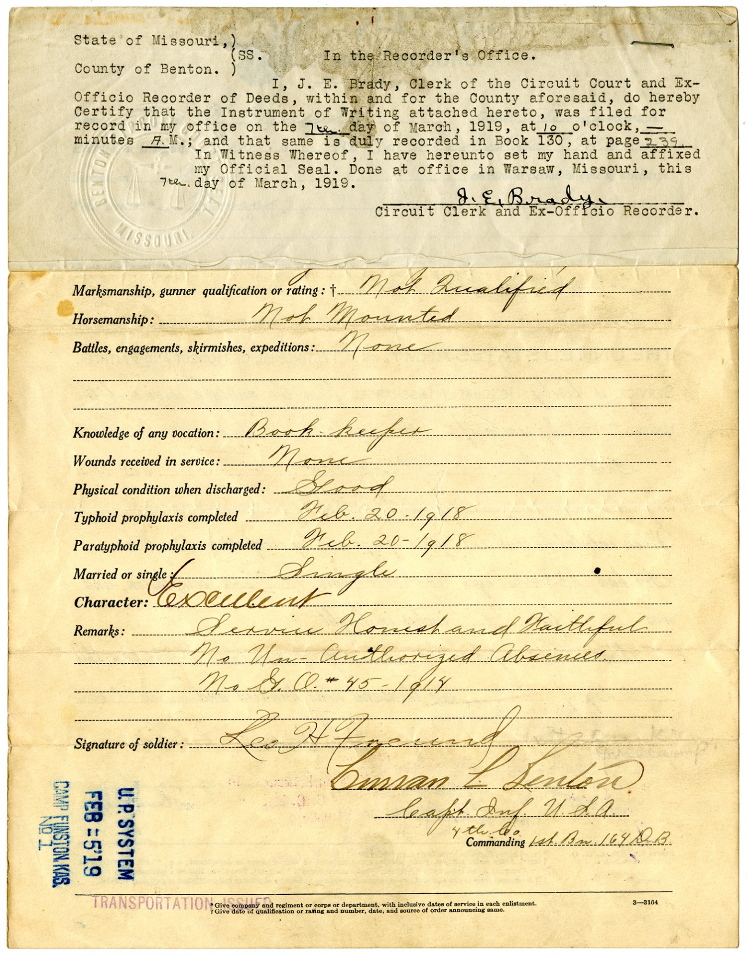 | Source | Freund, Leo H. Leo H. Freund Discharge and Enlistment Record. 5 February 1919. Bates County Historical Society and Museum World War I Collection. Bates County Historical Society, Butler, Missouri. |