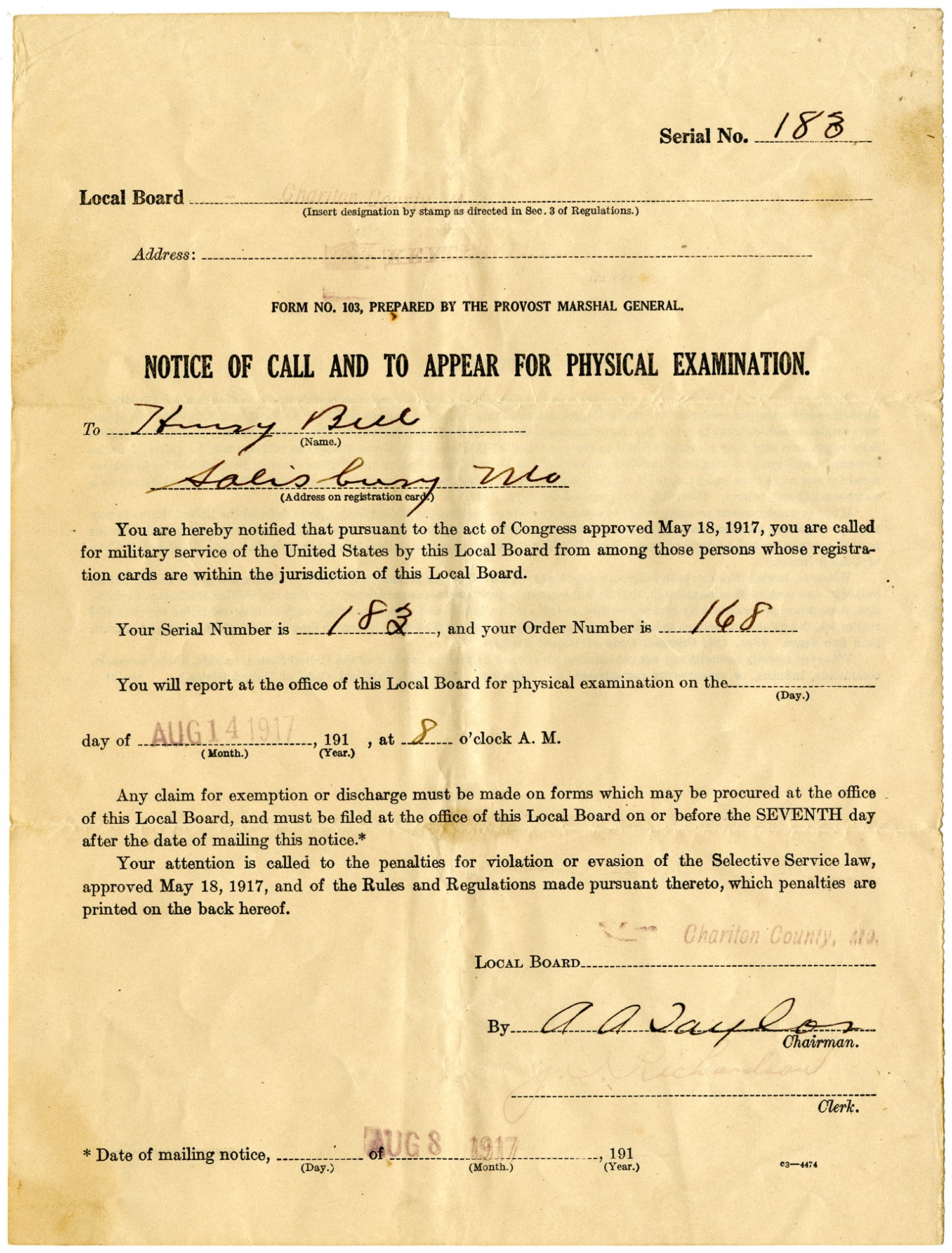 Serial No. 183 Local Board Chariton County (Insert designation by stamp as directed in Sec. 3 of Regulations.) Address: [ms illegible: 1 wd] FORM NO. 103, PREPARED BY THE PROVOST MARSHAL GENERAL. NOTICE OF CALL AND TO APPEAR FOR PHYSICAL EXAMINATION. To Henry Bell (Name.) Salisbury, [Missouri] (Address on registration card.) You are hereby notified that pursuant to the act of Congress approved May 18, 1917, you are called for military service of the United States by this Local Board from among those persons whose registration cards are within jurisdiction of this Local Board. Your Serial Number is 183, and your Order Number is 168 You will report at the office of this Local Board for physical examination on the (Day.) day of [August 14, 1917] (Month.), 191 (Year.), at 8 o
