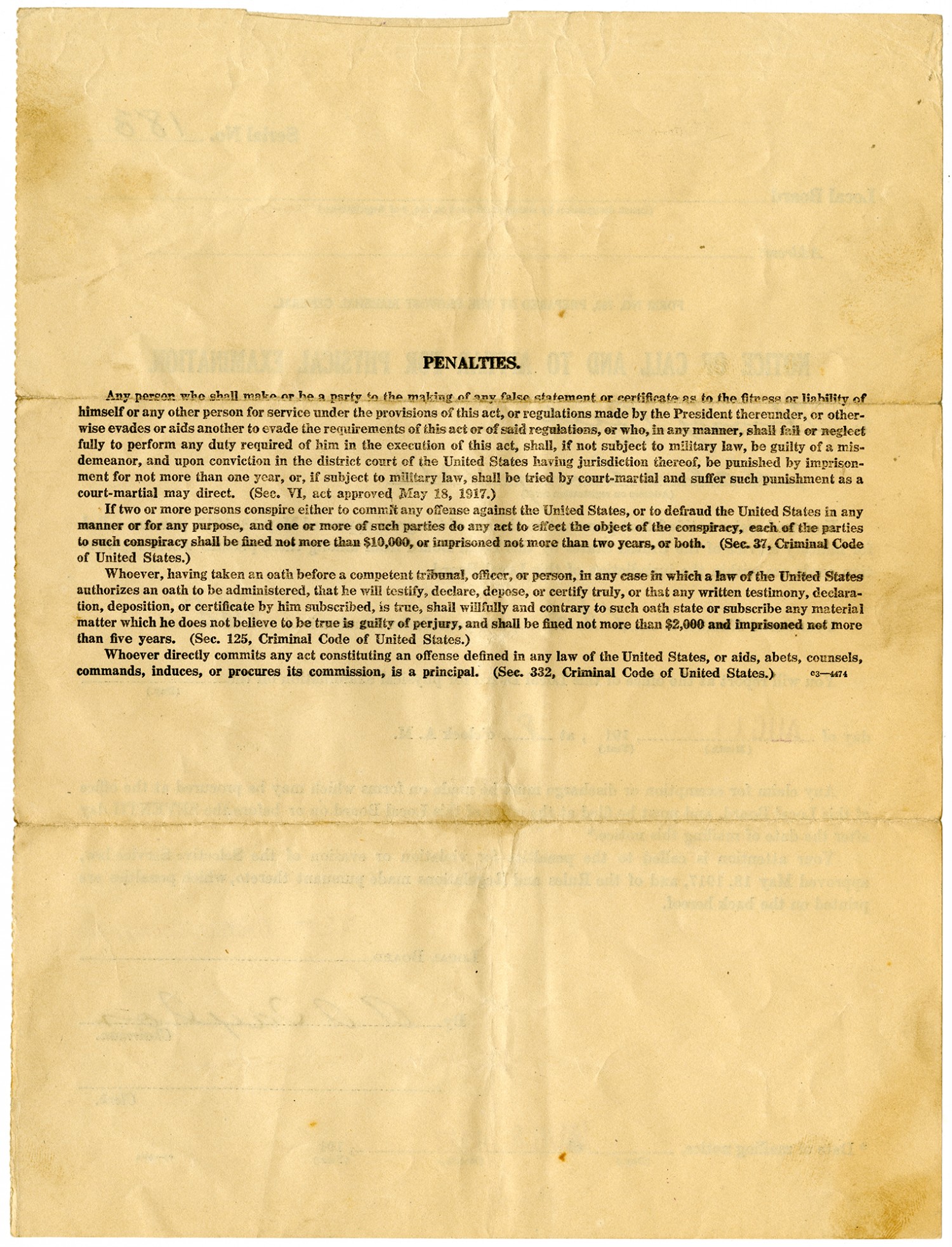 PENALTIES. Any person who shall make or be a party to the marking of any false statements or certificate as to the fitness or liability of himself or any other person for service under the provisions of this act, or regulations made by the President thereunder, or otherwise evades or aids another to evade the requirements of this act or of said regulations, or who, in any manner, shall fall or neglect fully to perform any duty required of him in the execution of this act, shall, if not subject to military law, be guilty of a misdemeanor, and upon conviction in the district court of the United States having jurisdiction thereof, be punished by imprisonment for not more than one year, or, if subject to military law, shall be tried by court-martial and suffer such punishment as a court-martial may direct. (Sec. VI, act approved May 18, 1917.) If two or more persons conspire either to commit any offense against the United States, or to defraud the United States in any manner or for any purpose, and one or more of such parties do any act to effect the object of the conspiracy, each of the parties to such conspiracy shall be fined not more than $10,000, or imprisoned not more than two years, or both. (Sec. 37, Criminal Code of United States.) Whoever, having taken an oath before a competent tribunal, officer, or person, in any case in which a law of the United States authorizes an oath to be administered, that he will testify, declare, depose, or certify truly, or that any written testimony, declaration, deposition, or certificate by him subscribed, is true, shall willfully and contrary to such oath state or subscribe any material matter which he does not believe to be true is guilty of perjury, and shall be fined not more the $2,000 and imprisoned not more than five years. (Sec. 125, Criminal Code of United States.) Whoever directly commits any act constituting an offense defined in any law of the United States, or aids, abets, counsels, commands, induces, or procures its commission, is a principal. (Sec. 332, Criminal Code of United States.)
