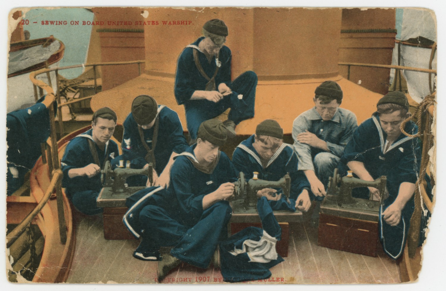 | Description | A postcard sent by Harry M. Bouser to his mother with an illustration of Navy men sewing on board a U.S. Naval Vessel, ca. 1917. |
