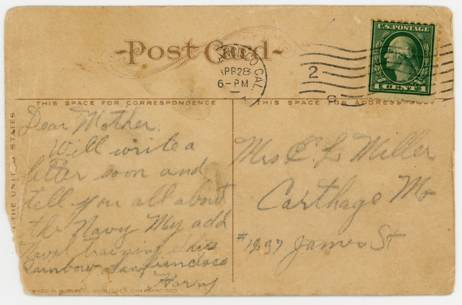 Dear Mother: Will write a letter soon and tell you all about the Navy May add Naval Training Ship Rainbow [illegible] Harry Mrs. E.L. Miller Carthage Mo #1237 James St.