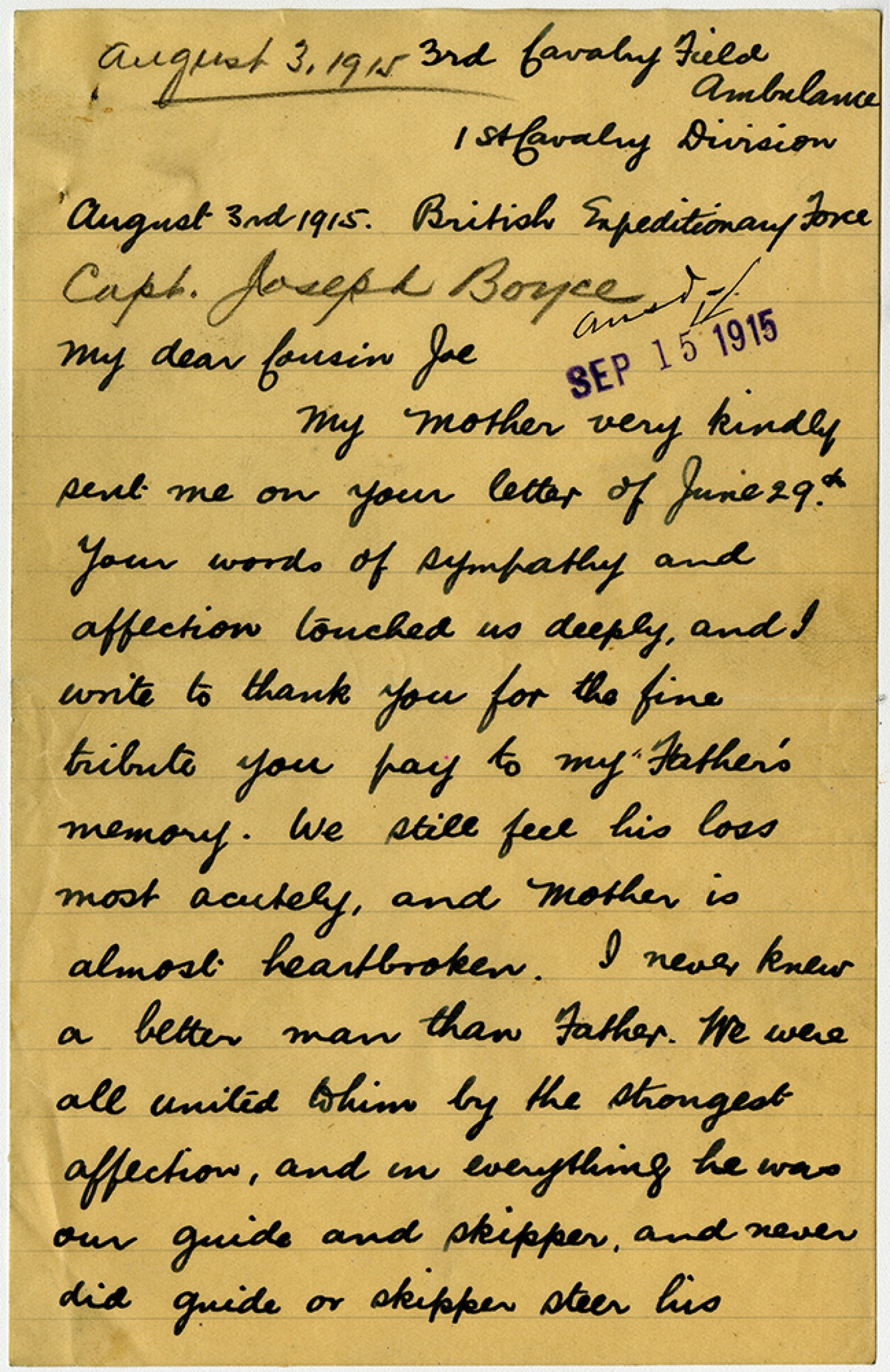 August 3, 1915 3rd Cavalry Field Ambulance 1st Cavalry Division British Expeditionary Force August 3rd 1915. Capt. Joseph Boyce My dear Cousin Joe My mother very kindly sent me on your letter of June 29th. Your words of sympathy and affection touched us deeply, and I write to thank for the fine tribute you pay to my Father’s memory. We still feel his loss most acutely, and Mother is almost heartbroken. I never knew a better man than Father. We were all united to him by the strongest affection, and in everything he was our guide and skipper, and never did guide or skipper steer his
