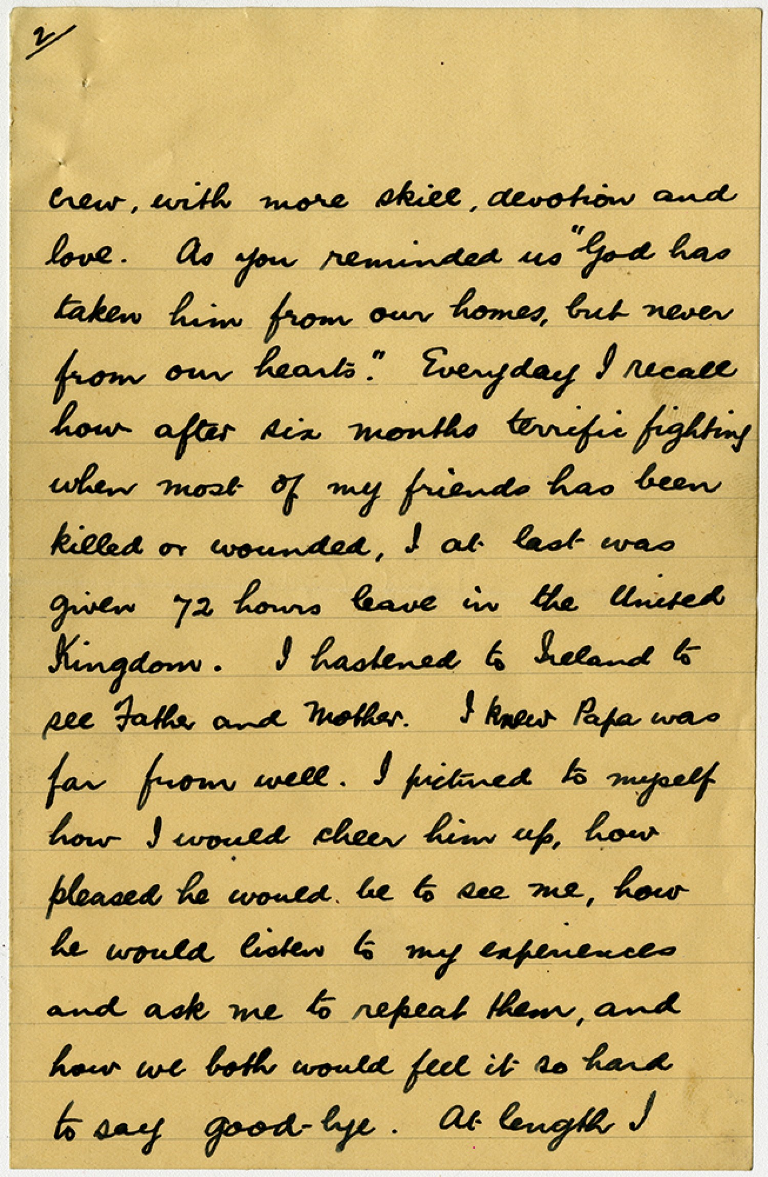 [Page 2] crew, with more skill, devotion and love. As you reminded us "God has taken him from our homes, but never from our hearts." Everyday I recall how after six months terrific fighting when most of my friends has been killed or wounded, I at last was given 72 hours leave in the United Kingdom. I hastened to Ireland to see Father and Mother. I knew Papa was far from well. I pictured to myself how I would cheer him up, how pleased he would be to see me, how he would listen to my experiences and ask me to repeat them, and how we both would feel it so hard to say good-bye. At length I