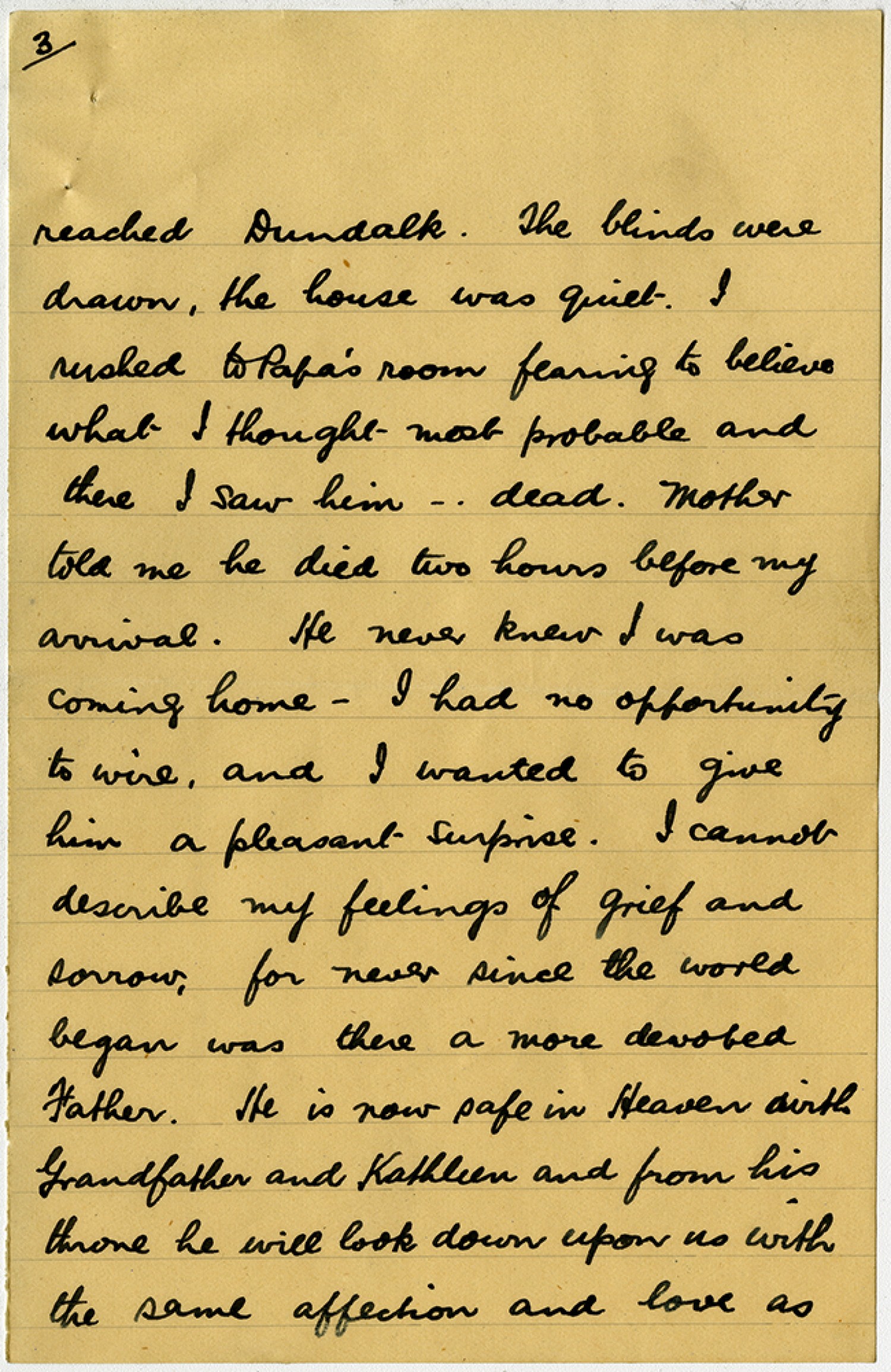 [Page 3] reached Dundalk. The blinds were drawn, the house was quiet. I rushed to Papa’s room fearing to believe what I thought most probably and there I saw him - dead. Mother told me he died two hours before my arrival. He never knew I was coming home - I had no opportunity to wire, and I wanted to give him a pleasant surprise. I cannot describe my feelings of grief and sorrow, for never since the world began was there a more devoted Father. He is now safe in Heaven with Grandfather and Kathleen and from his throne he will look down upon us with the same affection and love as