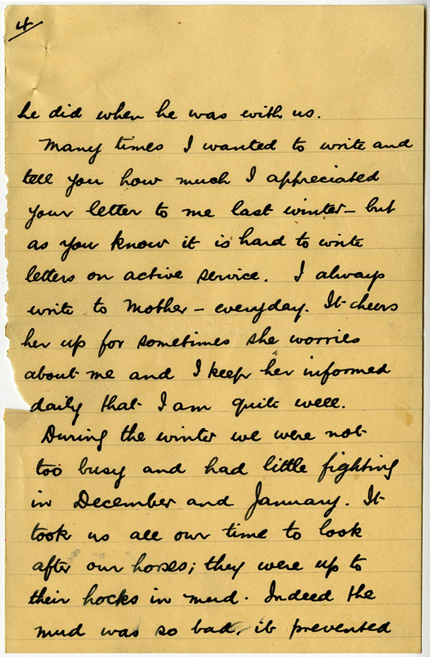 [Page 4] he did when he was with us. Many time I wanted to write and tell you how much I appreciated your letter to me last winter - but as your know it is hard to write letters on active service. I always write to Mother - everyday. It cheers her up for sometimes she worries about me and I keep her informed daily that I am quite well. During the winter we were not too busy and had little fighting in December and January. It took us all our time to look after our horses; they were up to their hocks in mud. Indeed the mud was so bad, it prevented
