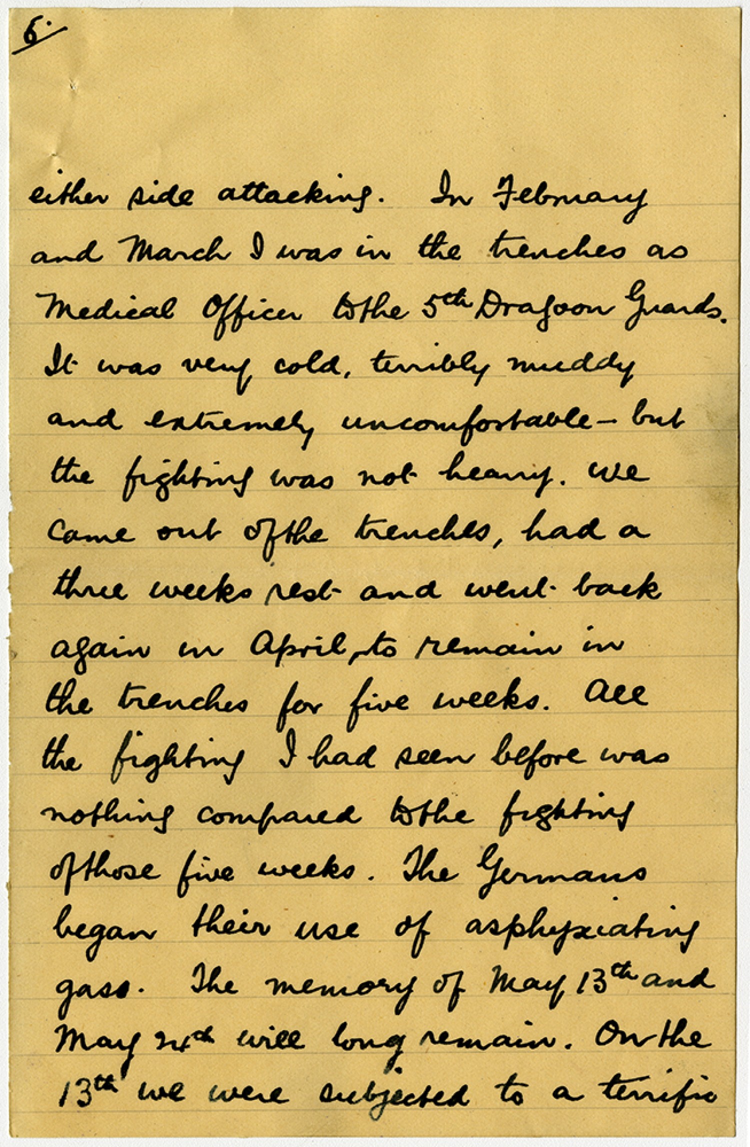 [Page 5] either side attacking. In February and March I was in the trenches as Medical Officer to the 5th Dragoon Guards. It was very cold, terribly muddy and extremely uncomfortable - but the fighting was not heavy. We came out of the trenches, had a three weeks rest and went back again in April to remain in the trenches for five weeks. All the fighting I had seen before was nothing compared to the fighting of those five weeks. The Germans began their use of asphyxiating gas. The memory of May 13th and May 24th will long remain. On the 13th we were subjected to a terrific