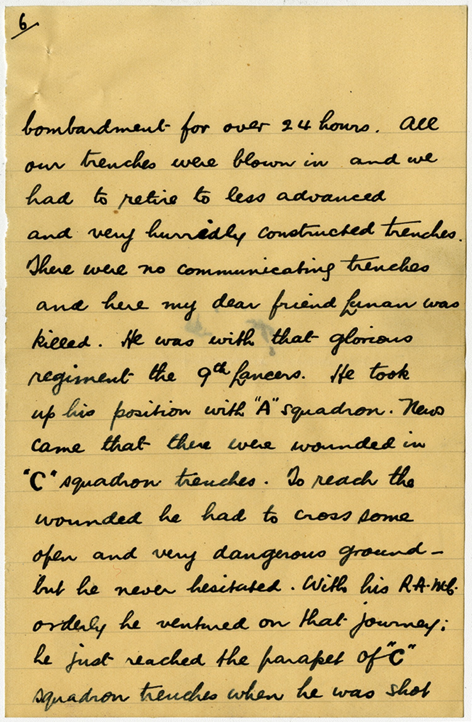 [Page 6] bombardment - for over 24 hours. All our trenches were blown in and we had to retire to less advanced and very hurriedly constructed trenches. There were no communicating trenches and here my dear friend Lunan was killed. He was with that glorious regiments the 9th Lancers. He took up his position with "A" squadron. News came that there were wounded in "C" squadron trenches. To reach the wounded he had to cross some open and very dangerous ground - but he never hesitated. With his RAMC orderly he ventured on that journey; he just reached the parapet of "C" squadron when he was shot