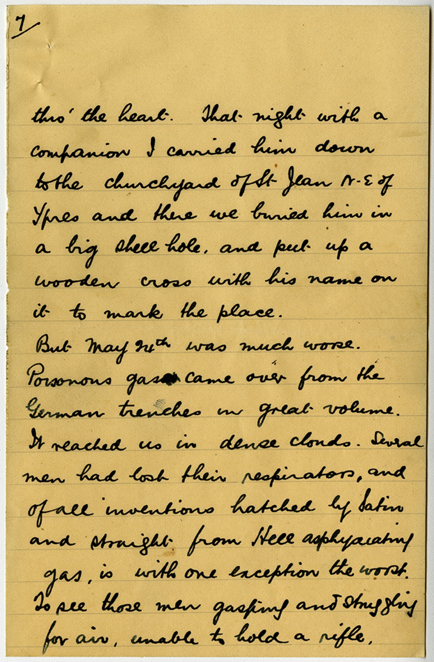 [Page 7] thro’ the heart. That night with a companion I carried him down to the churchyard of tSt Jean N-E of Ypres and there we buried him in a big shell hole, and put up a wooden cross with his name on it to mark the place. But May 24th was much worse. Poisonous gas came over from the German trenches in great volume. It reached us in dense clouds. Several men had lost their respirators, and all inventions hatched by Satin and straight from Hell asphyxiating gas, is with one exception the worst. To see those men gasping and struggling for air, unable to hold a rifle,