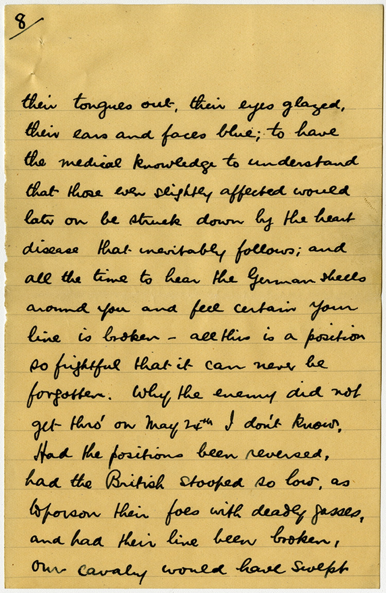 Page 8] their tongues out, their eyes glazed, their ears and faces blue; to have the medical knowledge to understand that those even slightly affected would later on be struck down by the heart disease that inevitably follows; and all the time to hear the German shells around you and feel certain your line is broken - all this is a position so frightful that it can never be forgotten. Why the enemy did not get thro'on May 24th I don’t know. Had the positions been reversed, had the British stooped so low, as to poison their foes with deadly gasses, and had their line been broken, our cavalry would have swept