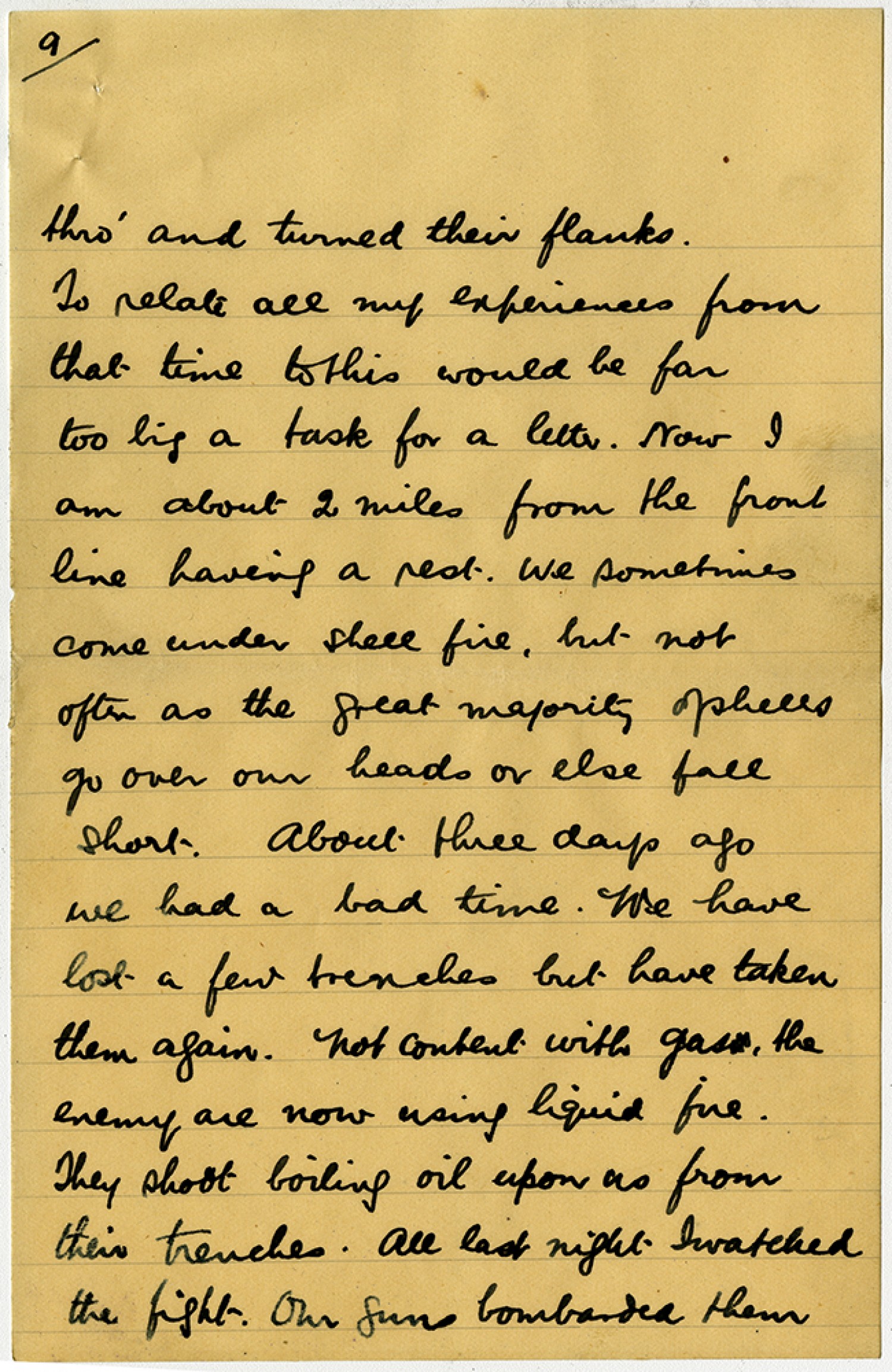[Page 9] thro’ and turned their flanks. To relate all my experiences from that time to this would be far too big a task for a letter. Now I am about 2 miles from the front line having a rest. We sometimes come under shell fire, but not often as the great majority of shells go over our heads or else fall short. About three days ago we had a bad time. We have lost a few trenches but have taken them again. Not content with gas, the enemy are now using liquid fire. They shoot boiling oil upon us from their trenches. All last night I watched the fight. Our guns bombarded them