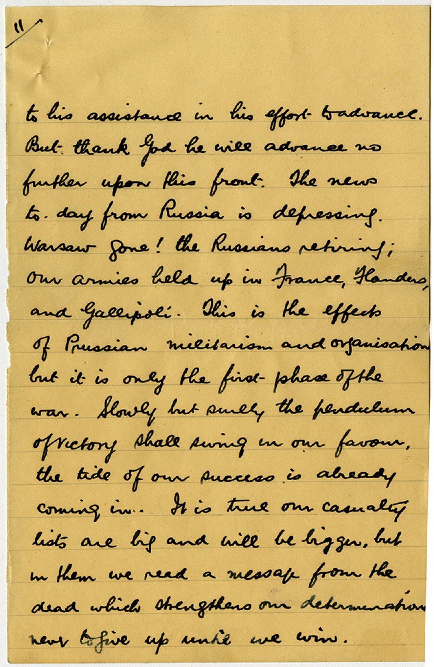 [Page 11] to his assistance in his effort to advance. But thank God he will advance no further upon this front. The news to-day from Russia is depressing. Warsaw gone! the Russians retiring; our armies held up in France, Flanders, and Gallipoli. This is the effects of Prussian militarism and organisation but it is only the first phase of the war. Slowly but surely the pendulum of victory shall swing in our favour, the tide of our success is already coming in. It is true our casualty lists are big and will be bigger, but in them we read a message from the dead which strengthens our determination never to give up until we win.
