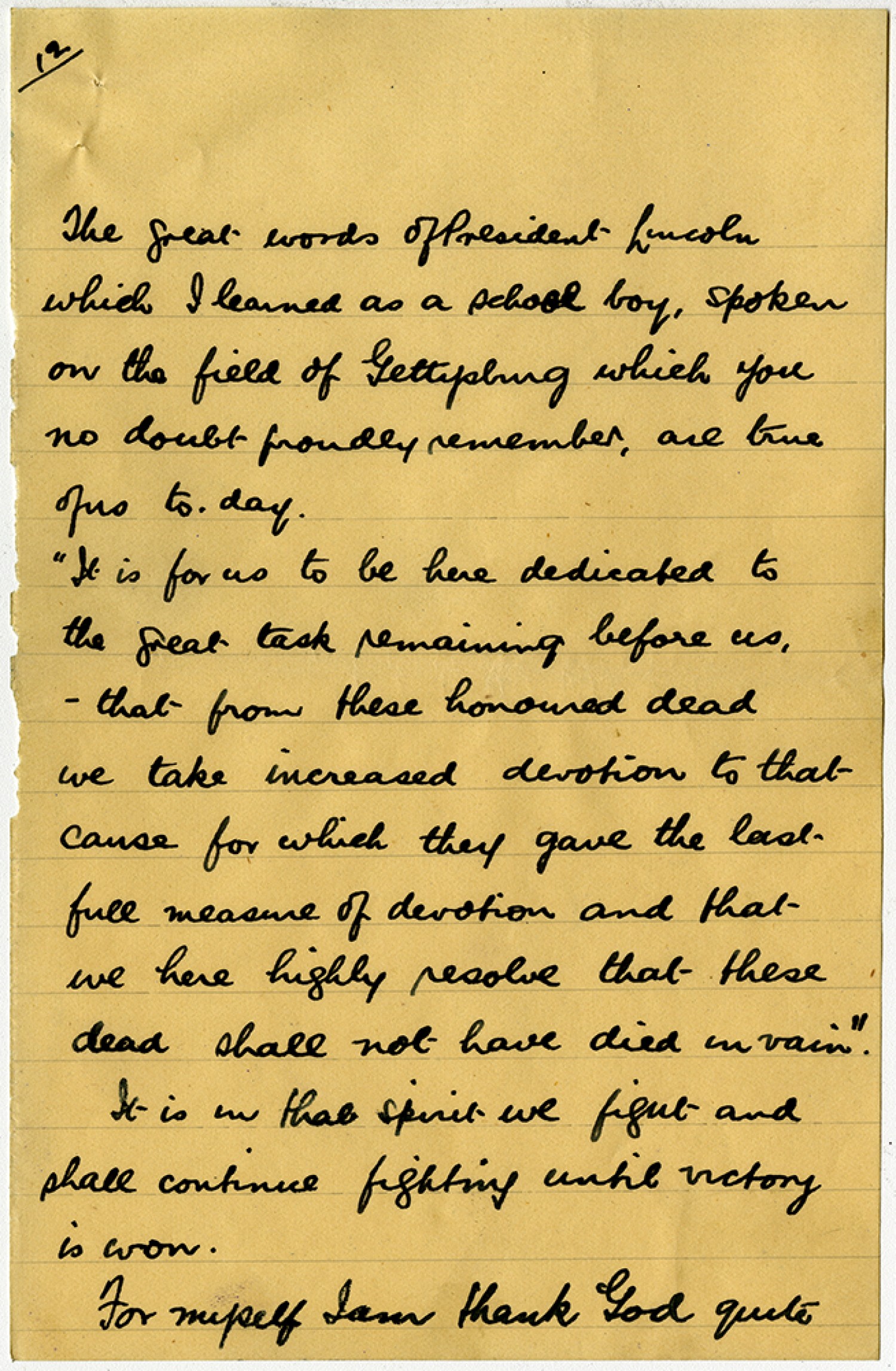 [Page 12] The great words of President Lincoln which I learned as a school boy, spoken on the field of Gettysburg which you no doubt proudly remember, are true of us to-day. "It is for us to be here dedicated to the great task remaining before us, - that from these honoured dead we take increased devotion to that cause for which they gave the last full measure of devotion and that we here highly resolve that these dead shall not have died in vain". It is in that spirit we fight and shall continue fighting until victory is won. For myself I am thank God quite