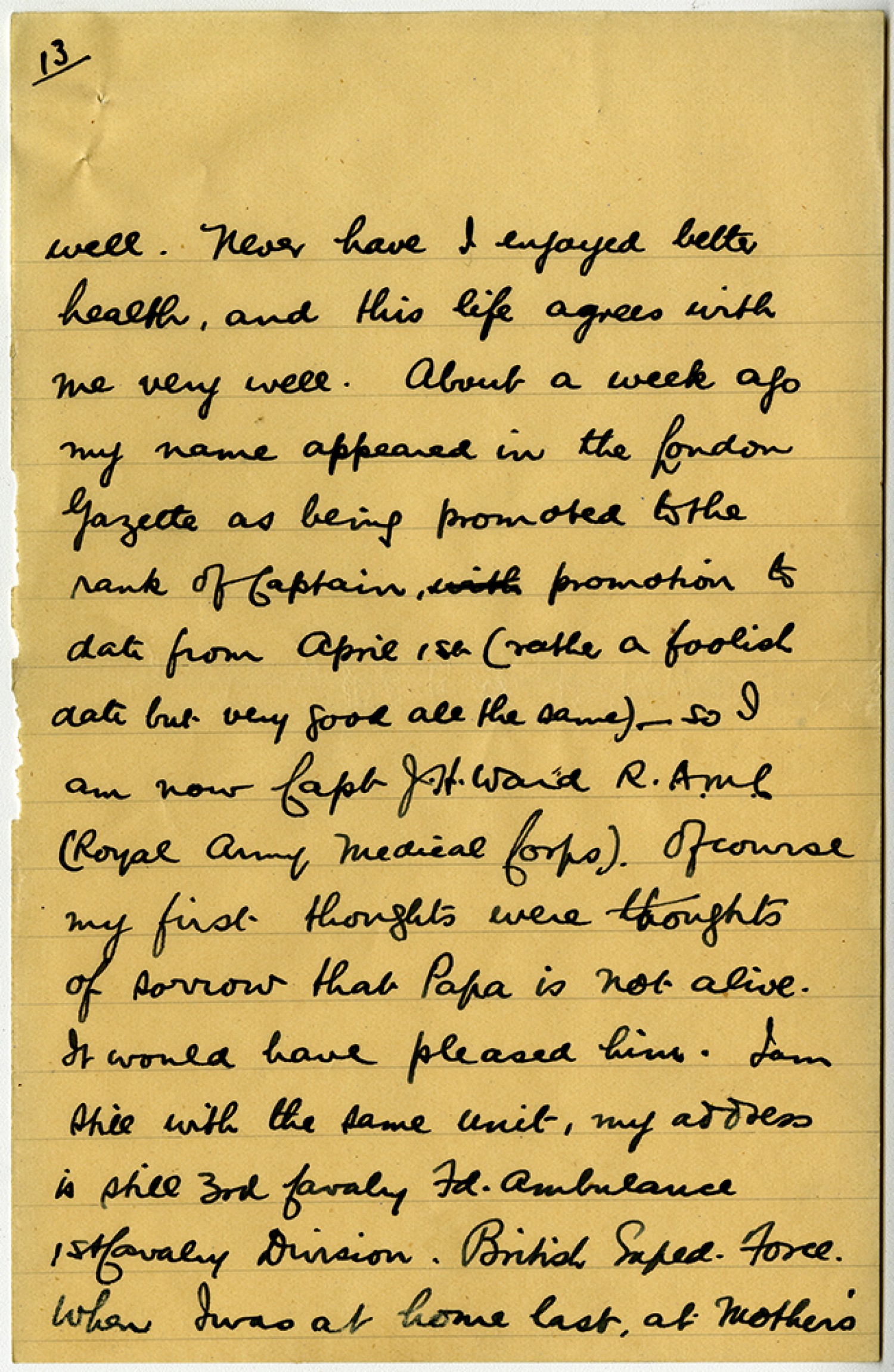 [Page 13] well. Never have I enjoyed better health, and this life agrees with me very well. About a week ago my name appeared in the London Gazette as being promoted to the rank of Captain, with promotion to date from April 1st (rathe a foolish date but very good all the same) - so I am now Capt J. H. Ward R.A.M.C. (Royal Army Medical Corps). Of course my first thoughts were thoughts of sorrow that Papa is not alive. It would have pleased him. I am still with the same unit, my address is still 3rd Cavalry Fd. Ambulance 1st Cavalry Division. British Exped. Force. When I was at home last, at Mother’s