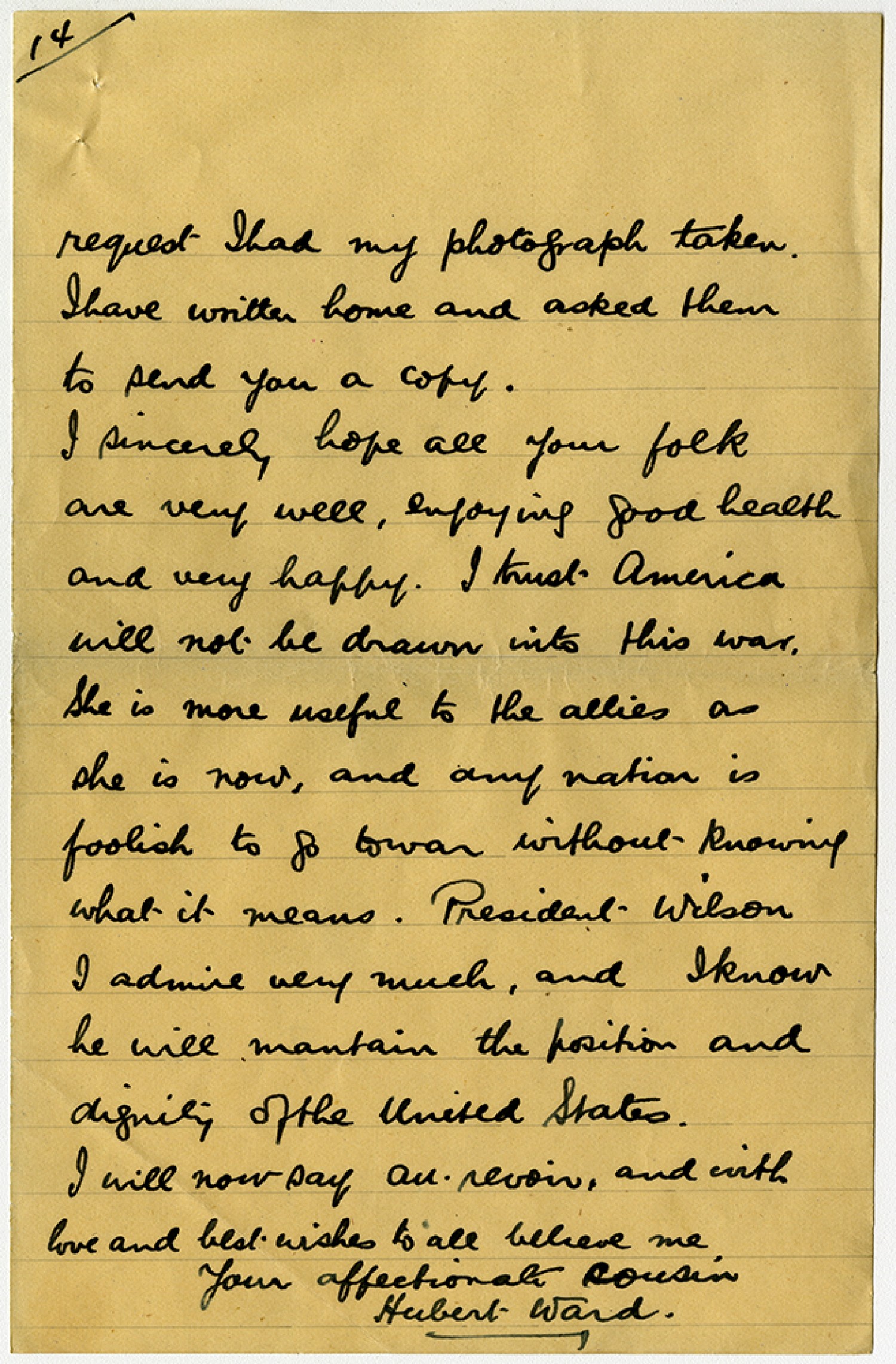 [Page 14] request I had my photograph taken. I have written home and asked them to send you a copy. I sincerely hope all your folk are very well, enjoying good health and very happy. I trust America will not be drawn into this war. She is more useful to the allies as she is now, and any nation is foolish to go to war without knowing what it means. President Wilson I admire very much, and I know he will mantain the position and dignity of the United States. I will now say au revoir, and with love and best wishes to all believe me Your affectionate cousin Hubert Ward.