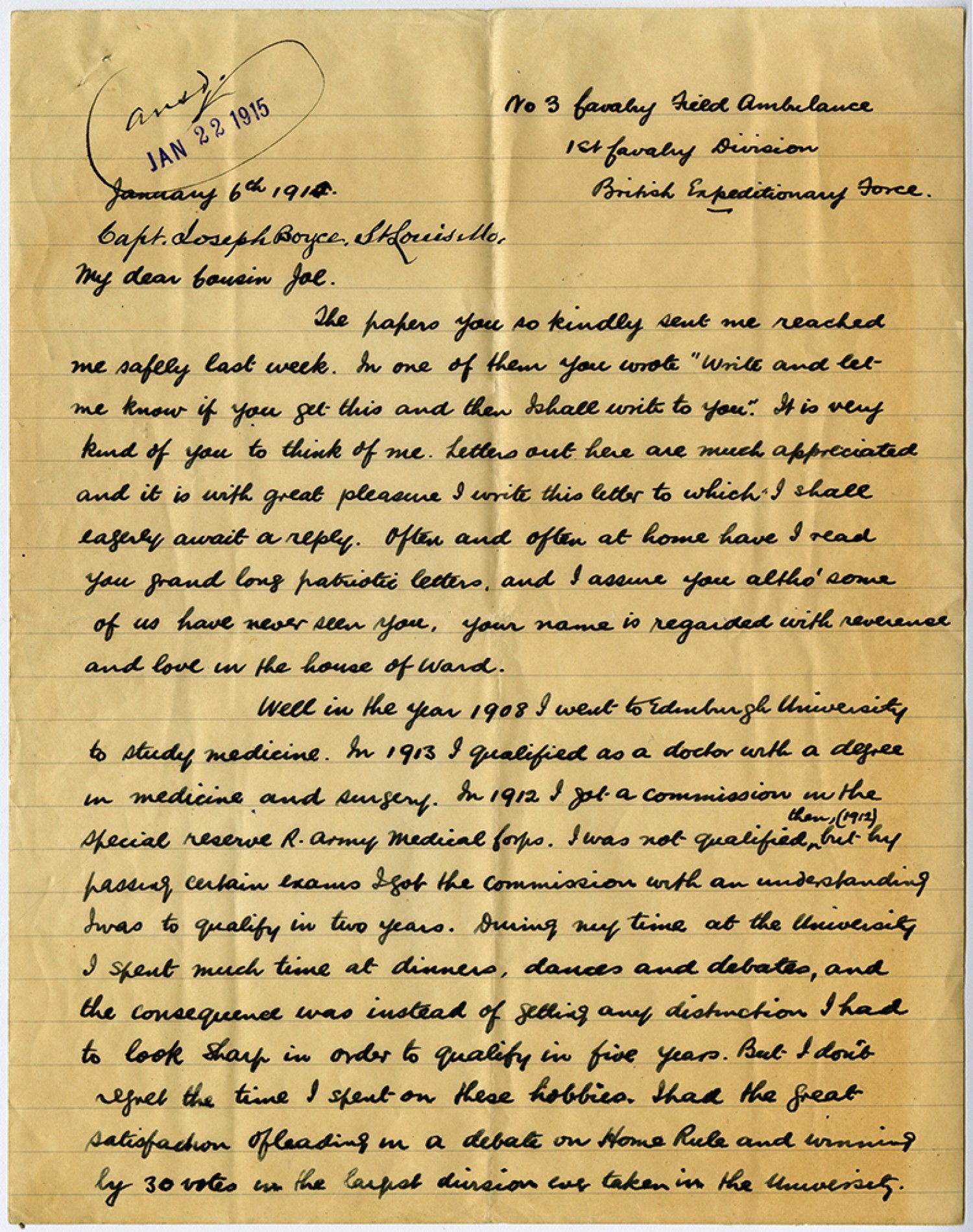 No 3 Cavalry Field Ambulance 1st Cavalry Division British Expeditionary Force. January 6th 1915. Capt. Joseph Boyce, St. Louis [Missouri]. My dear Cousin Joe. The papers you so kindly sent me reached me safely last week. In one of them you wrote "write and let me know if you get this and then I shall write to you." It is very kind of you to think of me. Letters out here are much appreciated and it is with great pleasure I write this letter to which I shall eagerly await a reply. Often and often at home have I read you grand long patriotic letters, and I assure you altho’ some of us have never seen you, your name is regarded with reverence and love in the house of Ward. Well in the year 1908 I went to Edinburgh University to study medicine. In 1913 I qualified as a doctor with a degree in medicine and surgery. In 1912 I got a commission in the special reserve R Army Medical Corps. I was qualified then, (1912) but by passing certain exams I got the commission with an understanding I was to qualify in two years. During my time at the University I spent much time at dinners, dances and debates, and the consequence was instead of getting any distinction I had to look sharp in order to qualify in five years. But I don’t regret the time I spent on these hobbies. I had the great satisfaction of leading in a debate on Home Rule and winning by 30 votes in the largest division ever taken in the university.