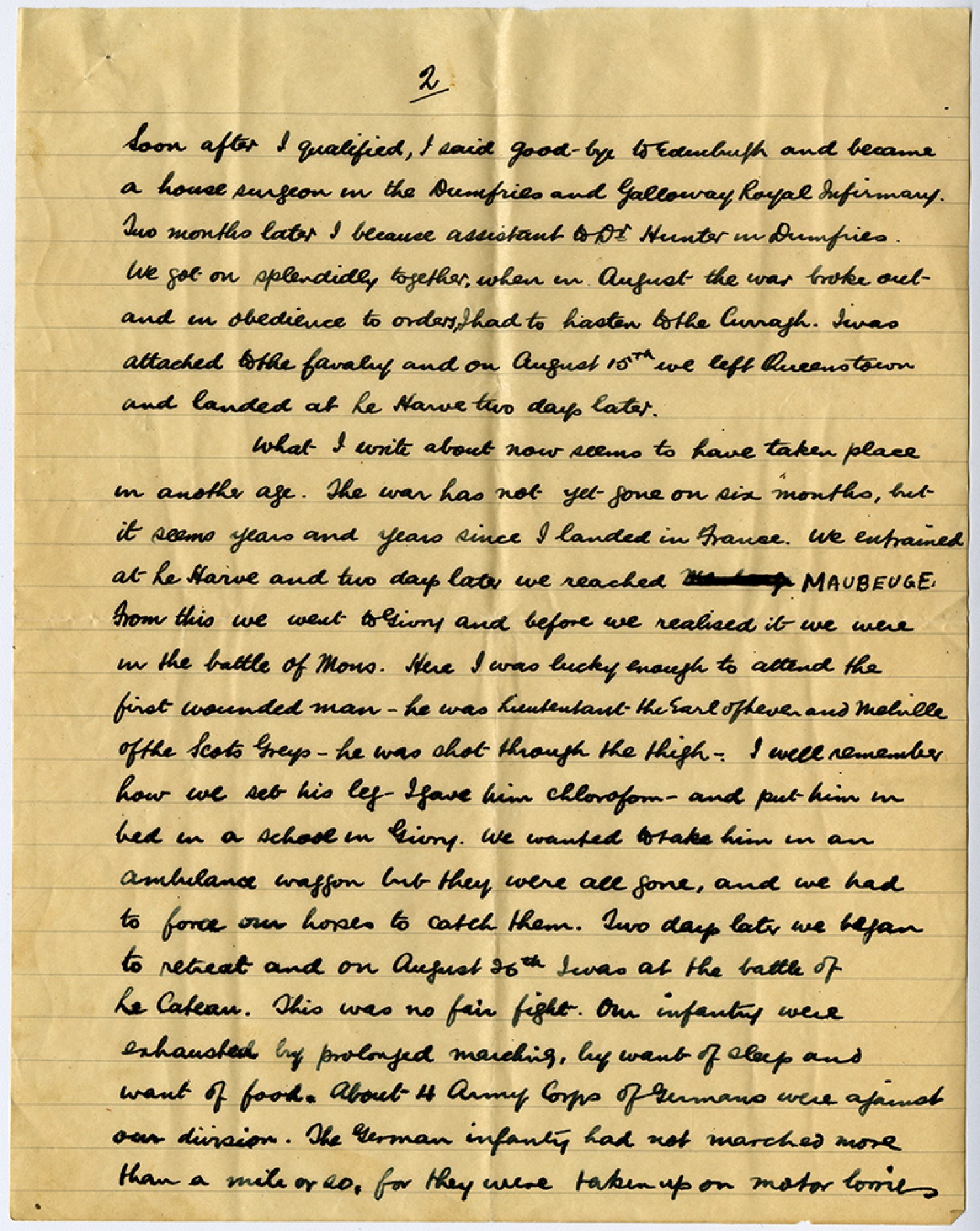 [Page 2] Soon after I qualified, I said good-bye to Edinburgh and became a house surgeon in the Dumfries and Galloway Royal Infirmary. Two months later I because assistant to Dr Hunter in Dumfries. We got on splendidly together, when in August the war broke out - and in obedience to orders, I had to hasten to the Curragh. I was attached to the cavalry and on August 15th we left Queenstown and landed at the [Le Havre] two days later. What I write about now seems to have taken place in another age. The war has not yet gone on six months, but it seems years and years since I landed in France. We entrained at [Le Havre] and two days later we reached MAUBEUGE. From this we went to Givry and before we realised it we were in the battles of Mons. Here I was lucky enough to attend the first wounded man - he was Lieutenant - the Earl of Leven and Melville of the Scot Greys - he was shot through the thigh. I will remember how we set his leg - I gave him chloroform - and put him in bed in a school in Givry. We wanted to take him in an ambulance waggon but they were all gone, and we had to force our hopes to catch them. Two days later we began to retreat and on August 26th I was at the battle of Le Cateau. This was no fair fight. Our infantry were exhausted by prolonged marching, by want of sleep and want of food. About - 4 Army Corps of Germans were against our division. The German infantry had not marched more than a mile or so, for they were taken up on motor lorries