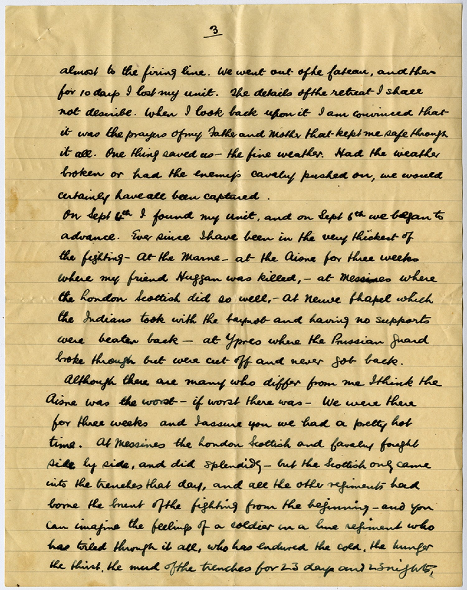 [Page 3] almost to the firing line. We went out of the Cateau, and then for 10 days I lost my unit. The details of the retreat I shall not describe. When I look back upon it I am convinced that it was the prayers of my Father and Mother that kept me safe through it all. One thing saved us - the fine weather. Had the weather broken or had the enemy’s cavalry pushed on, we would certainly have all been captured. On [September] 6th I found my unit, and on [September] 6th we began to advance. Ever since I have been in the very thickest of the fighting - at the Marne - at the Aisne for three weeks where my friend Huggan was killed, - at Messines where the London Scottish did so well. - at [Neuve Chapellle] which the Indians took with the bayonet and having no supports were beaten back - at Ypres where the Prussian guard broke through but were cut-off and never got back. Although there are may who differ from me I think the Aisne was the worst - if worst there was - we were there for three weeks and I assure you we had a pretty hot time. At Messines the London Scottish and Cavalry fought side by side, and did splendid - but the Scottish only came into the trenches that day, and all the other regiments had borne the brunt of the fighting from the beginning - and you can imagine the feelings of a soldier in a line regiment who has toiled through it all, who has endured the cold, the hunger the thirst, the mud of the trenches for 23 days and 23 nights,