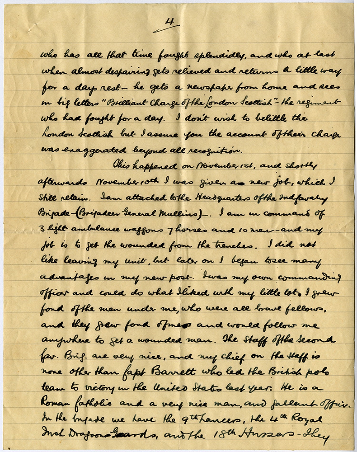 [Page 4] who has all that time fought splendidly, and who at last when almost despairing gets relieved and returns a little way for a days rest - he gets a newspaper from home and sees in big letters "Brilliant Charge of the London Scottish" - the regiment who had fought for a day. I don’t wish to belittle the London Scottish but I assure you the account of their charge was exaggerated beyond all recognition. This happened on November 1st, and shortly afterwards November 10th I was given a new job, which I still retain. I am attached to the Headquarters of the 2nd Cavalry Brigade - (Brigadier General [R. L. Mullens]) -. I am in command of 3 light ambulance waggons 7 horses and 10 men - and my job is to get the wounded from the trenches. I did not like leaving my unit, but later on I began to see many advantages in my new post. I was my own commanding officer and could do what I liked with my little lot. I grew fond of the men under me, who were all brave fellows, and they grew fond of me and would follow me anywhere to get a wounded man. The staff of the Second Cav. Brig. are very nice, and my chief on the staff is none other than Capt Barrett who led the British polo team to victory in the United States last year. He is a Roman Catholic and a very nice man, and gallant officer. In the brigade we have the 9th Lancers, the 4th Royal Irish Dragoon Guards, and the 18th Hussars. They