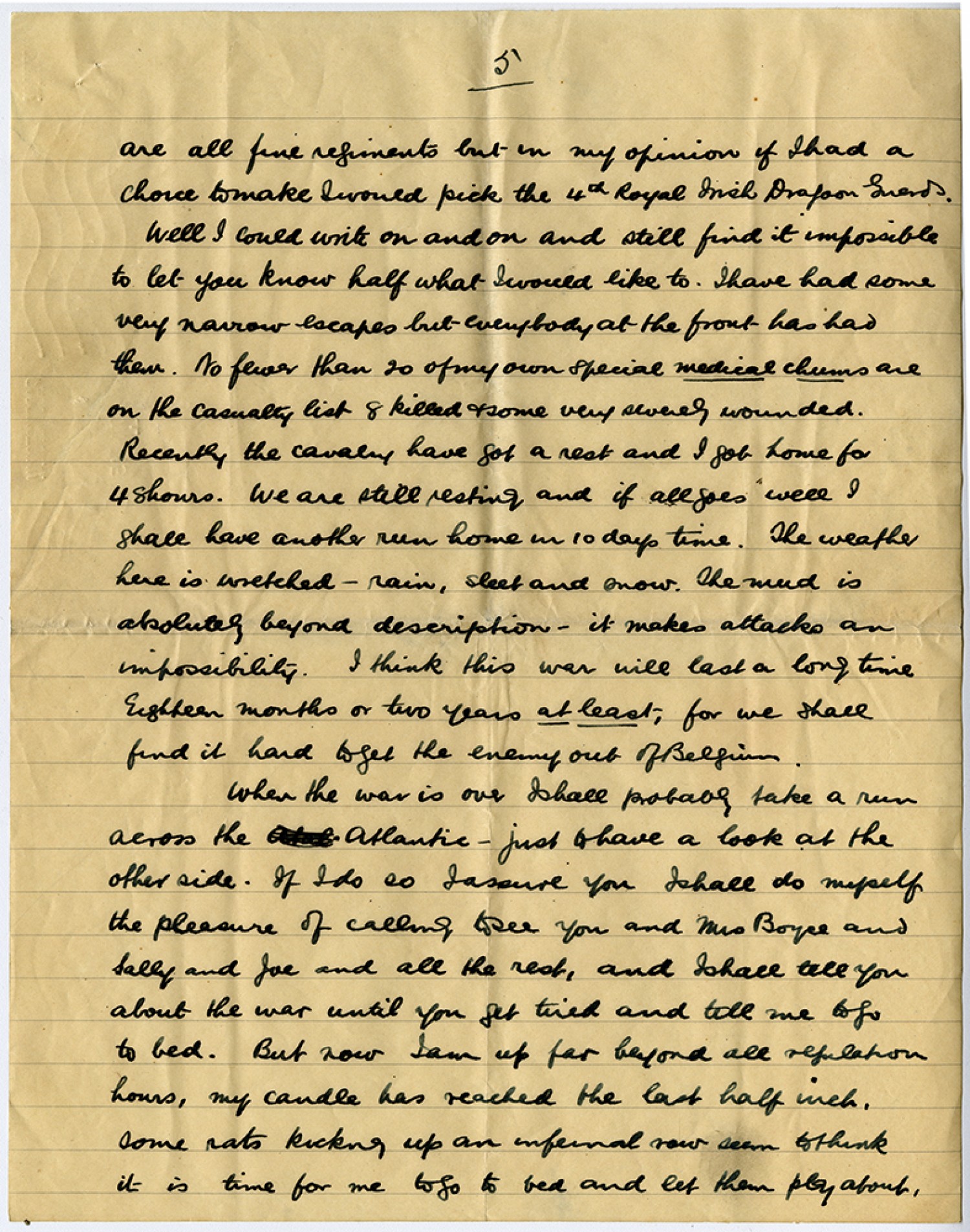 [Page 5] are all fine regiments but in my opinion if I had a choice to make I would pick the 4th Royal Irish Dragoon Guards. Well I could write on and on and still find it impossible to let you know half what I would like to. I have had some very narrow escapes but everybody at the front has had them. No fewer than 20 of my own special medical chums are on the casualty list 8 killed & some very severely wounded. Recently the cavalry have got a rest and I got home for 48 hours. We are still resting and if all goes well I shall have another run home in 10 days time. The weather here is wretched - rain, sleet and snow. The mud is absolutely beyond description - it makes attacks an impossibility. I think this war will last a long time Eighteen months or two years at least; for we shall find it hard to get the enemy out of Belgium. When the war is over I shall probably take a run across the Atlantic - just to have a look at the other side. If I do so I assure you I shall do myself the pleasure of calling to see you and Mrs Boyce and Sally and Joe and all the rest, and I shall tell you about the war until you get tired and tell me to go to bed. But now I am up far beyond all regulation hours, my candle has reached the last half inch, some rats kicking up an infernal now seem to think it is time for me to go to bed and let them play about,