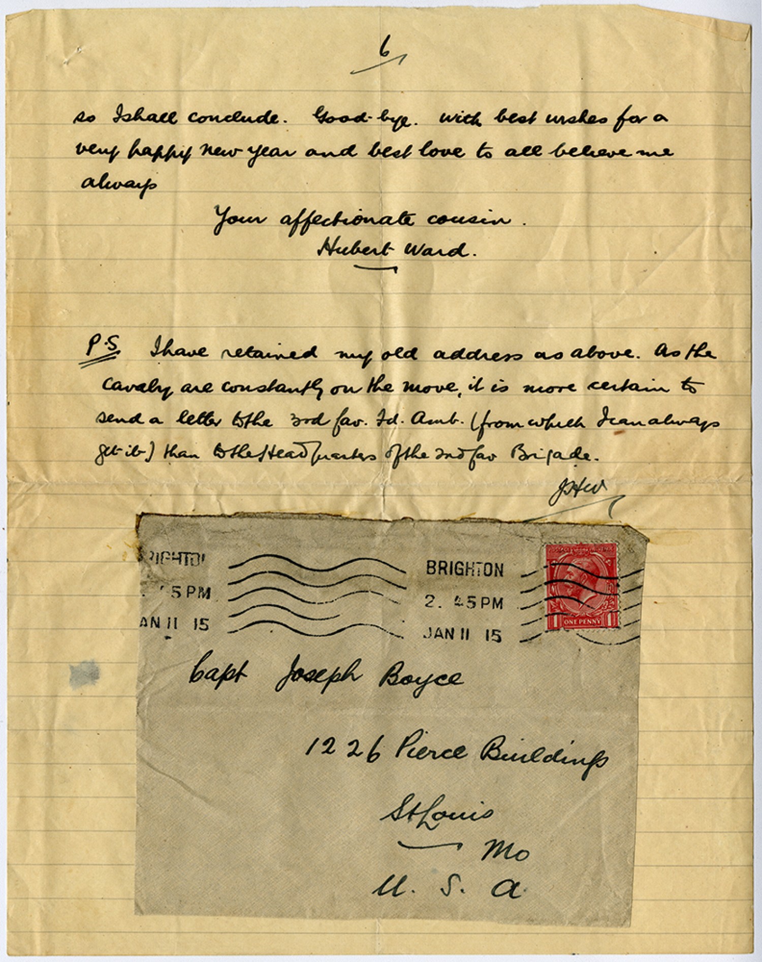 [Page 6] so I shall conclude. Good-bye with best wishes for a very happy new year and best love to all believe me always Your affectionate cousin Hubert Ward. P.S. I have retained my old address as above. As the cavalry are constantly on the move, it is more certain to send a letter to the 3rd Cav. Fd. Amb. (from which I can always get it) than to the Headquarters of the 2nd Cav Brigade. JHW [envelope] Capt Joseph Boyce 1226 Pierce Buildings St Louis [Missouri] U.S.A.