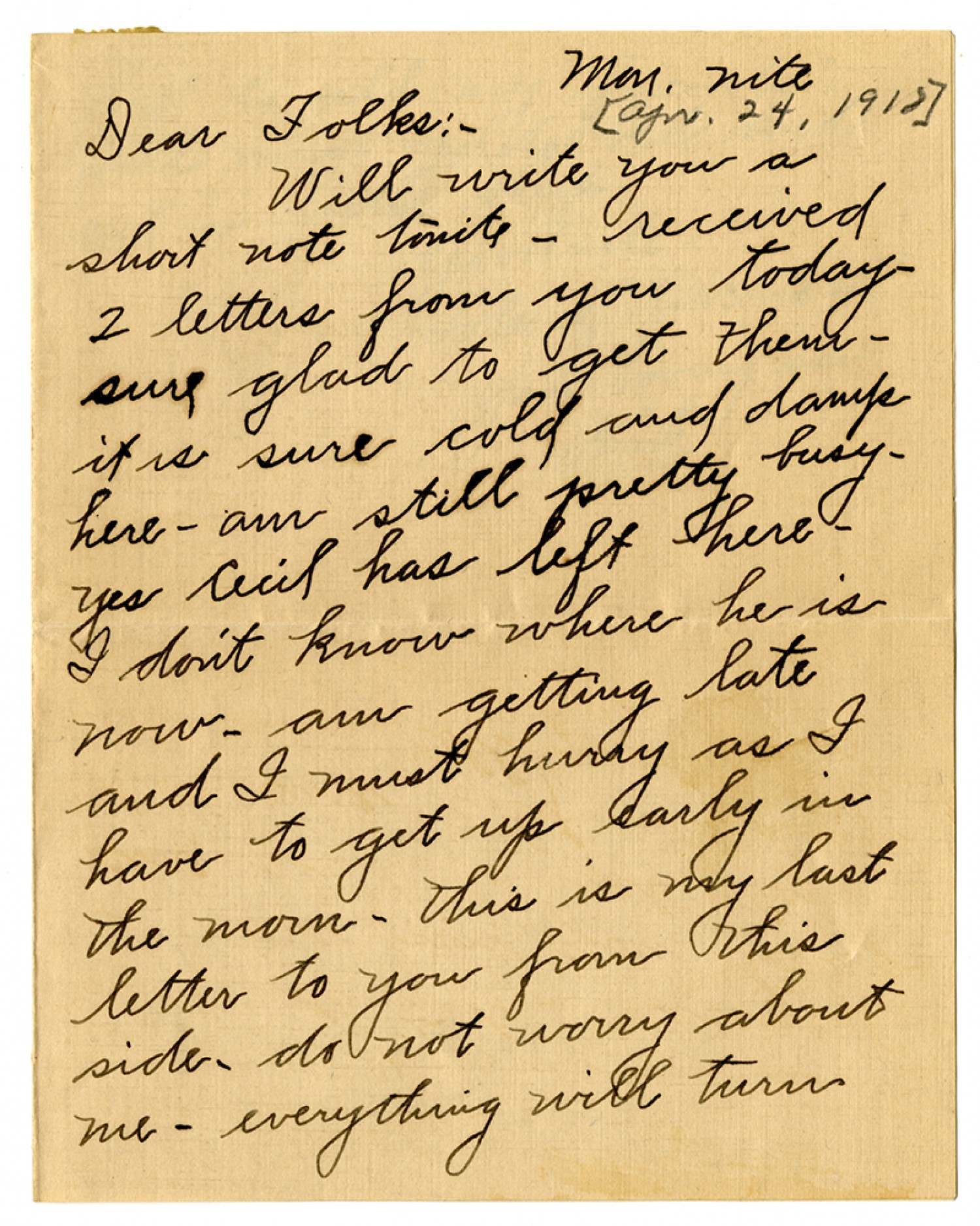[April 24, 1918] [Monday] nite Dear Folks: - Will write you a short note tonite - received 2 letters from you today - sure glad to get them - it is sure cold and damp here - am still pretty busy - yes Cecil has left here - I don't know where he is now - am getting late I must hurry as I have to get up early in the morn - this is my last letter to you from this side- do not worry about me - everything will turn