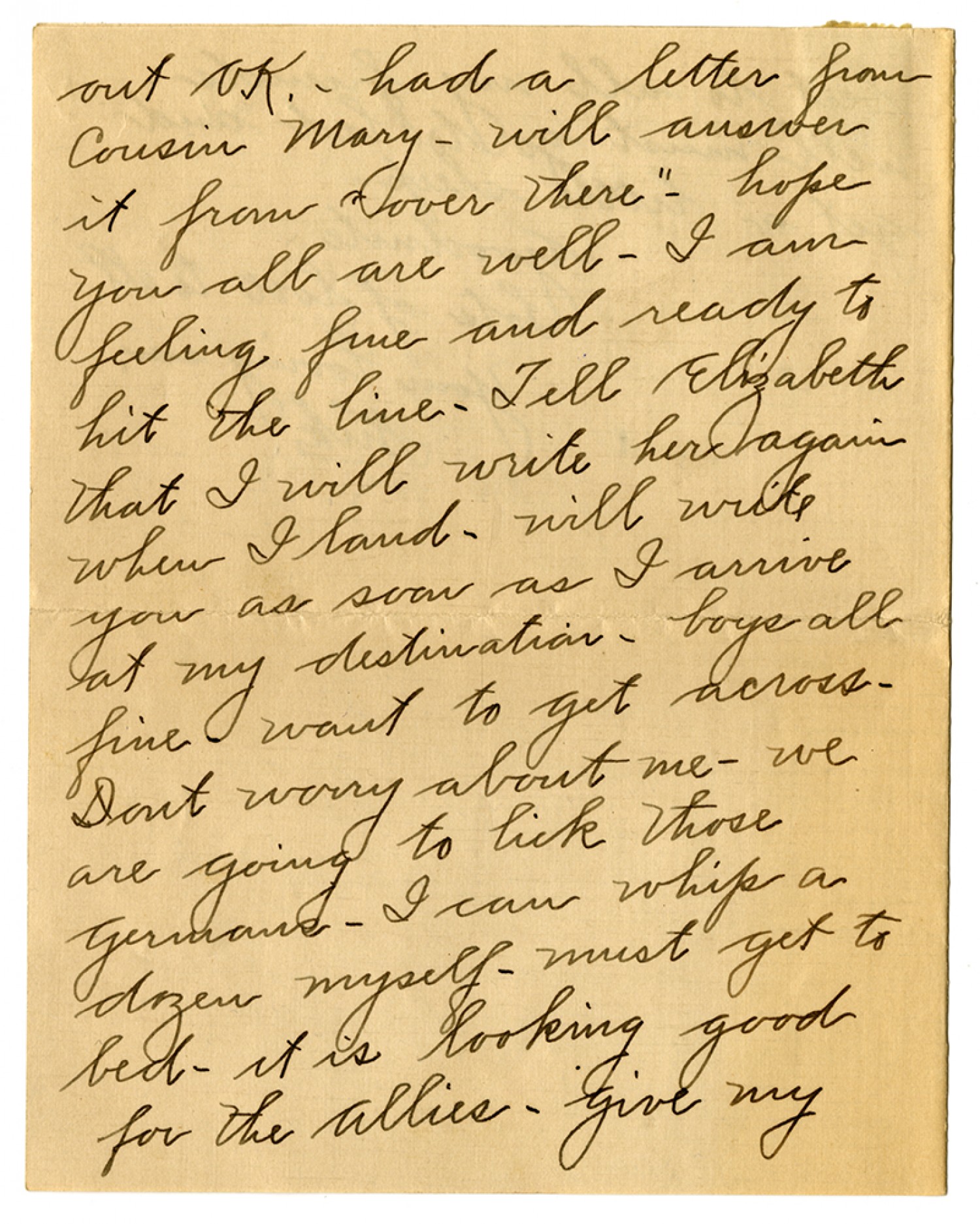 out O.K. - had a letter from cousing Mary - will answer it from "over there" - hope you all are well - I am feeling fine and ready to hit the line - Tell Elizabeth that I will write her again when I land. will write you as soon as I arrive at my destination- boys all fine want to get across - Dont worry about me - we are going to lick those Germans - I can whip a dozen myself - must get to bed - it is looking good for the Allies - give my