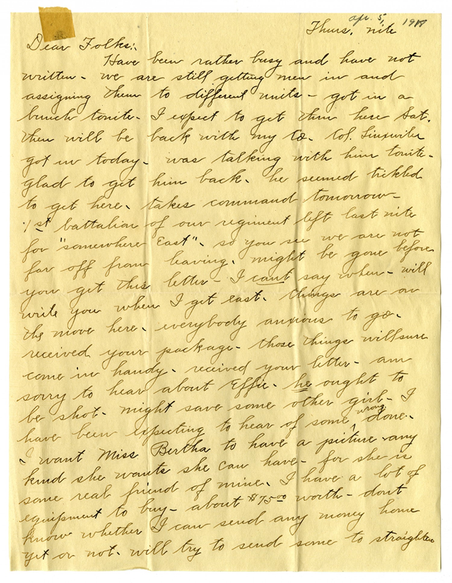 [April 5, 1917] [Thursday] nite Dear Folks:- Have been rather busy and have not written - we are still getting men in and assigning them to different units - got in a bunch tonite- I expect to get them here [Saturday] then ill be back with my Co. Col. Liuxwiler got in today - was talking with him tonite - glad to get him back - he seemed tickled to get here - takes command tomorrow - 1st battalion of our regiment left last nite for "somewhere East" - so you see we are not far off from leaving. might be gone before you get this letter - I cant say when - will write you when I get east. things are on the move here. everybody anxious to go - received your package- those things will sure come in hand - received your letter - am sorry to hear about Effie. he ought to be shot. might save some other girl - I have been expecting to hear of some wrong done- I want Mis Bertha to have a picture any kind she wants she can have - for she is some real friend of mine- I have a lot of equipment to buy - about $75 00 worth - dont know whether I can send any money home yet or not. will try to send some to straighten