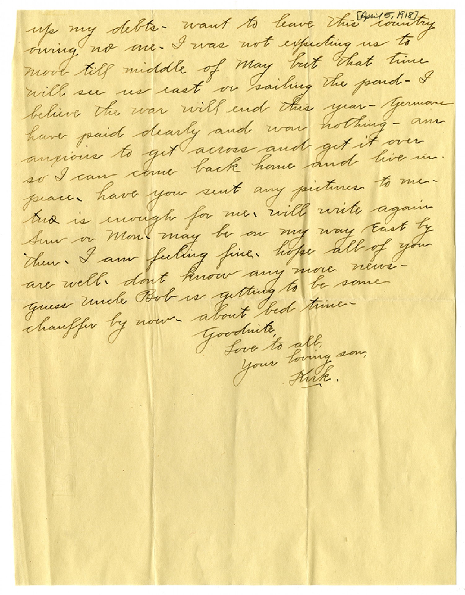 up my debts- want to leave this country owing no one. I was not expecting us to move till middle of May but that time will see us east or sailing the pond - I believe the war will end this year - Germans have paid dearly and won nothing - am anxious to ge tacross and get it over so I can come back home and live in peace- have you sent any pictures to me- two is enough for me- will write again Sun or Mon- may be on my way East by then. I am feeling fine. hope all of you are well. dont know any more news- guess Uncle Bob is getting to be some chauffer by now- about bed time- Goodnite, Love to all, Your loving son, Kirk.