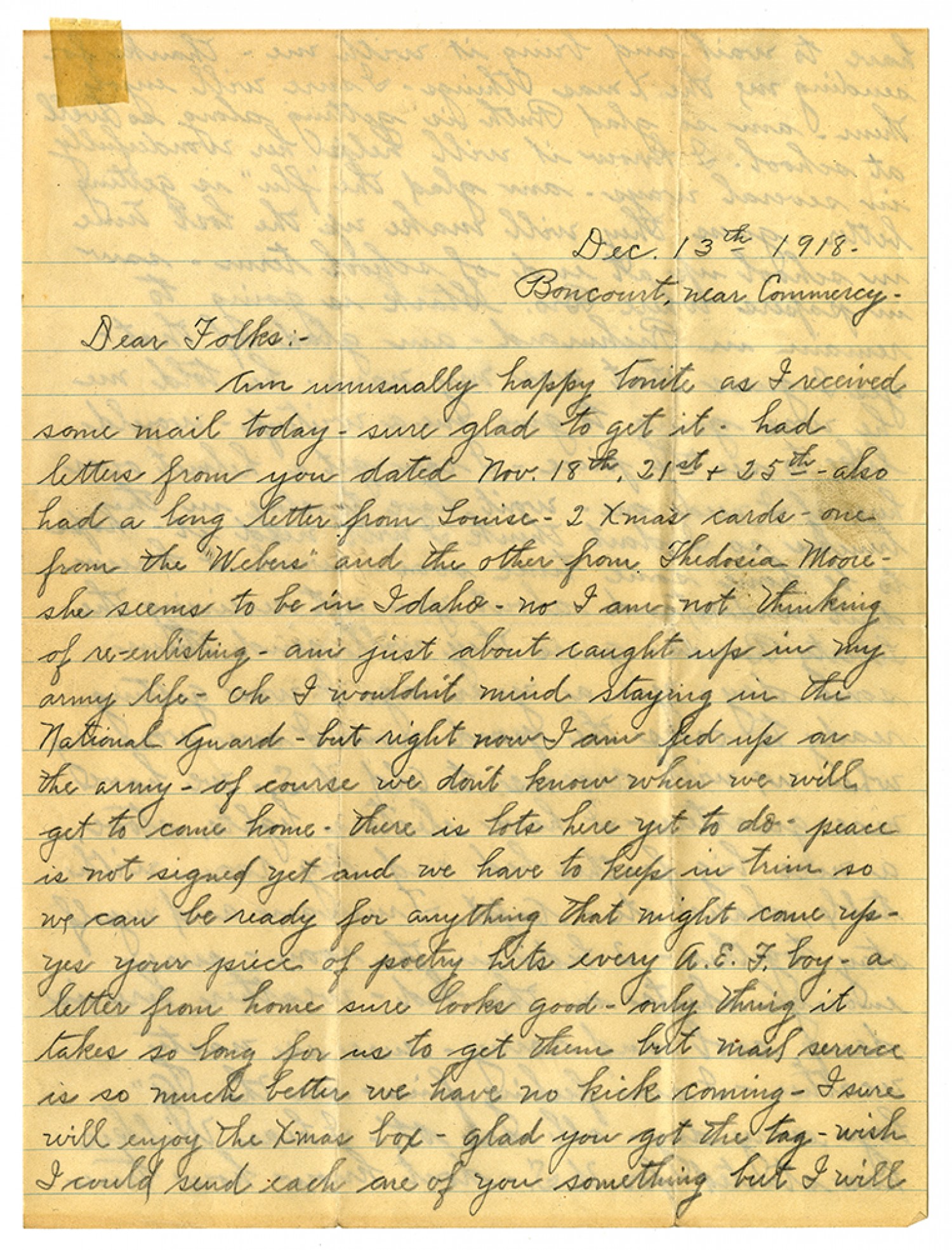 [December] 13th 1918 - Boncourt, near Commercy - Dear Folks:- Am unusually happy tonite as I received some mail today - sure glad to get it - had letters from you dated [November] 18th, 21st & 25th - also had a long letter from Louise - 2 Xmas cards -one from the "Webers" and the other from Thedosia Moore - she seems to be in Idaho - no I am not thinking of re-enlisting - am just about caught up in my army life - oh I wouldn't mind staying in the National Guard - but right now I am fed up on the army - of course we don't know when we will get to come home - there is lots here yet to do - peace is not signed yet and we have to keep in trim so we can be ready for anything that might come up - yes your price of poetry hits every A.E.F. boy - a letter from home sure looks good - only thing it takes so long for us to get them but mail service is so much better we have no kick coming - I sure will enjoy the Xmas box - glad you got the tag - wish I could send each one of you something but I will