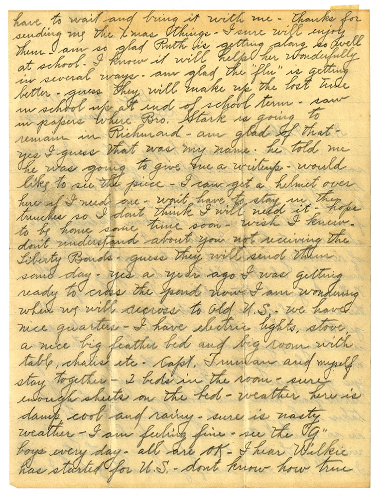 have to wait and bring it with me - thanks for sending me the Xmas things - I sure will enjoy them - am so glad Ruth is getting along so well at school - I know it will help her wonderfully in several ways - am glad the "flu" is getting better - guess they will make up the lost time in school up at end of school term - saw in papers where Bro. Stark is going to remain in Richmond - am glad of that - yes I guess that was my name - he told me he was going to give me a writeup - would like to see the piece - I can get a helmet over here if I need one - won't have to stay in the trenches so I dont think I will need it - hope to be home some time soon - wish I knew - don't understand about you not receiving the Liberty Bonds - guess they will send them same day - yes a year ago I was getting ready to cross the pond now I am wondering when we will across to hte Old U.S. - we have nice quarters - I have electric lights, stove, a nice big feather bed and big room with table, chairs etc - Capt. Truman and myself stay together - 2 beds in the room - sure enough sheets on the bed - weather here is damp cool and rainy - sure is nasty weather - I am feeling fine - see the "G" boys every day - all are OK - I hear Wilkie has started for U.S. - dont know how true