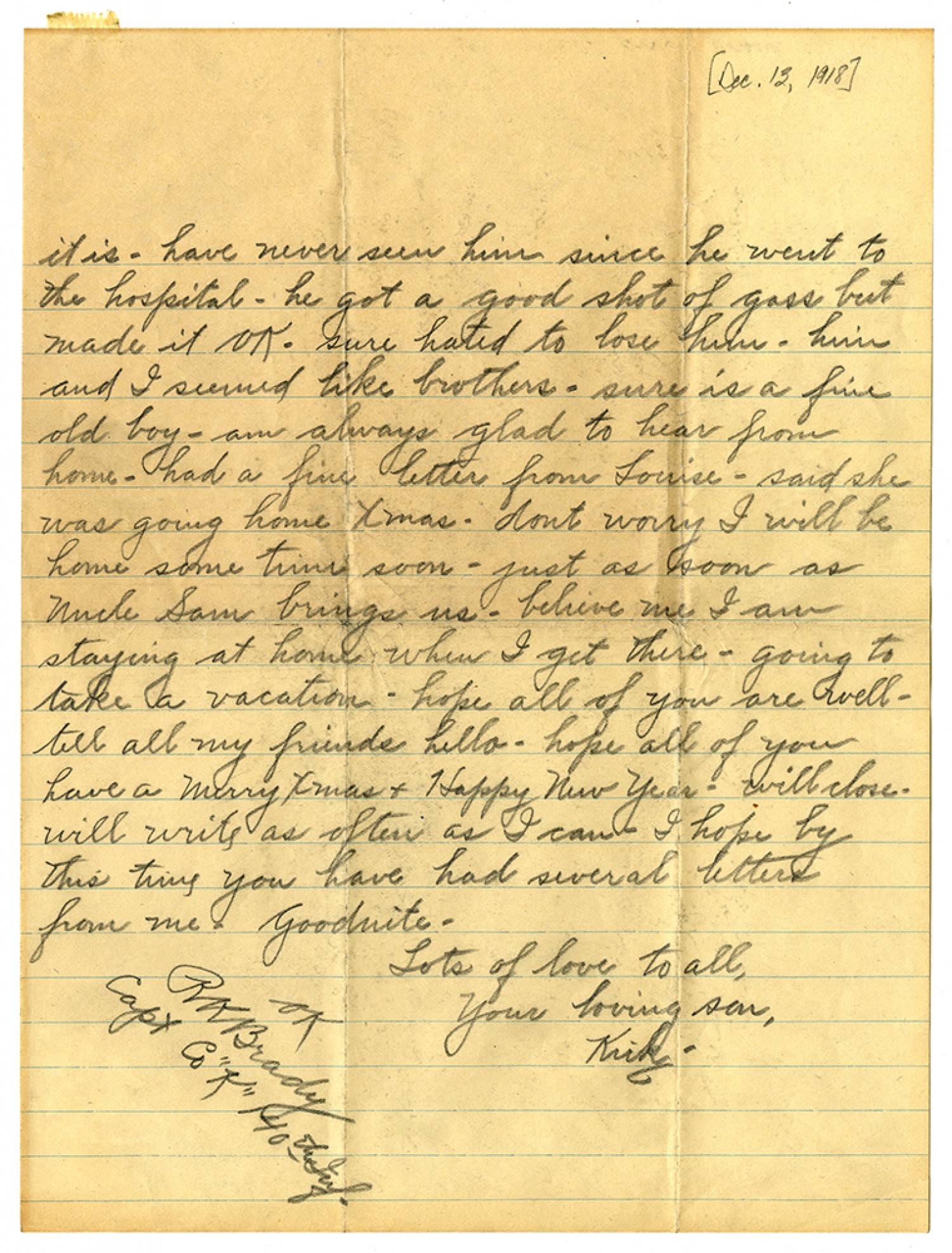 it is - have never seen him since he went to the hospital - he got a good shot of gass but made it OK - sure hated to lose him - him and I seemed like brothers - sure is a fine old boy - am always glad to hear from home - had a fine lettter from Louise - said she was going home Xmas - dont worry I will be home some time soon - just as soon as Uncle Sam brings us - believe me I am staying at home when I get there - going to take a vacation - hope all of you are well - tell all my friends hello - hope all of you have a Merry Xmas & Happy New Year - will close - will write as often as I can - I hope by this time you have had seceral letters from me - Goodnite - Lots of love to all, Your loving son, Kirk - OK RKBrady Capt Co "K" 140th Inf.