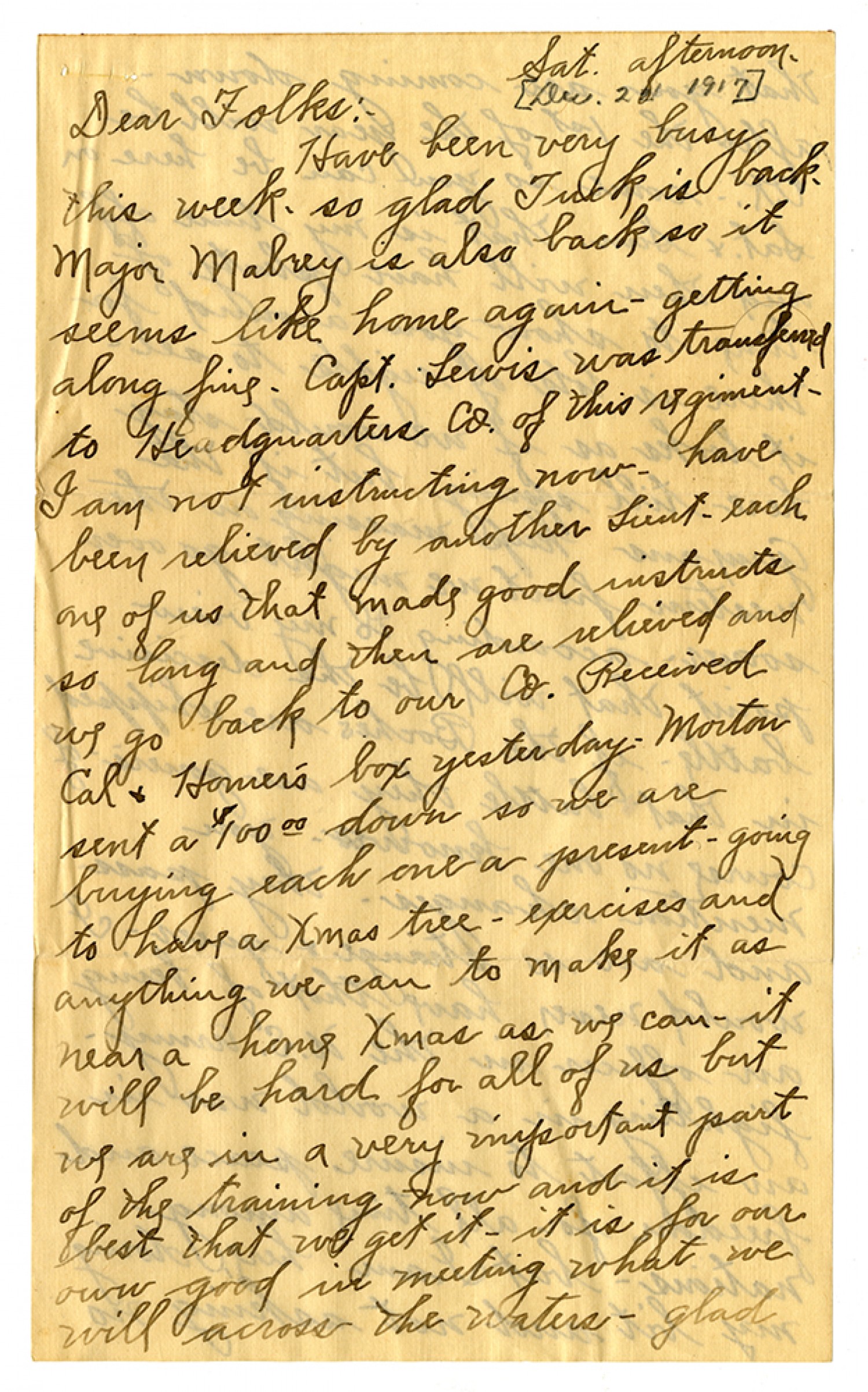 Sat. afternoon. [December 22, 1917] Dear Folks: - Have been very busy this week. so glad Tuck is back - Major Mabrey is also back so it seems like home again - getting along fine. Capt. Lewis was transferred to Headquarters Co. of this regiment - I am not instructing now - have been relieved by another Lieut - each one of us that made good instructs so long and then are relieved and we go back to our Co. Received Cal & Homer's box yesterday. Morton sent a $100 00 down so we are buyng each one a present - going to have a Xmas tree - exercises and anything we can to make it as near a home Xmas as we can - it will be hard for all of us but we are in a very important part of the traiing now and it is best that we get it - it is for our own good in meeting what we will across the waters - glad