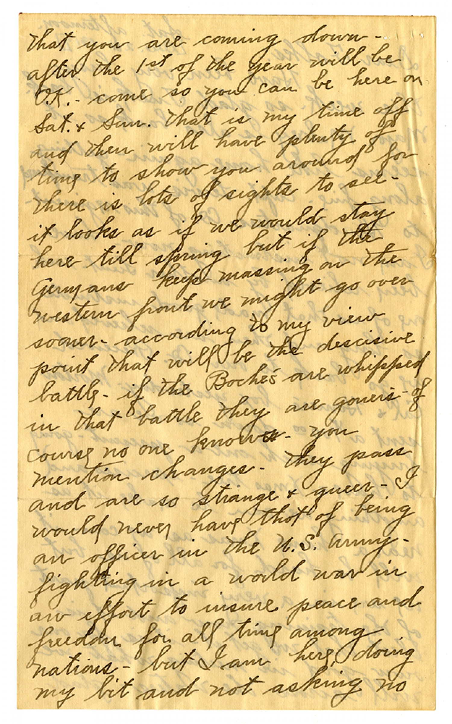 that you are coming down - after the 1st of he year will be O.K. come so you can be here on Sat. & Sun. That is my time off and then will have plentry of time to show you around for there is lots of sights to see - it looks as if we would stay here till spring but if the Germans keep massing on the Western front we might go over sooner. according to my view point that will be the decisive battle - if the Boche's are whippped in that battle they are goners - of course no one knows. you mention changes. they pass and are so strange and queer - I would never have thot of being an officer in the U.S. Army - fighting in a world war in an effort to insure peace and freedom for all time among nations - but I am here doing my bit and not asking no