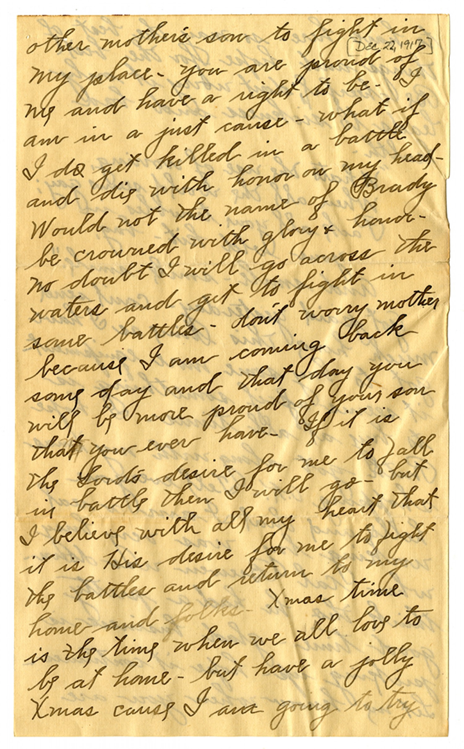other mother's son to fight in my place. you are proud of me and have a right to be. I am in a just cause - what if I do get killed in battle and die with honor on my head - Would not the name of Brady be crowned with glory & honor - no doubt I will go across the waters and get to fight in some battles - don't worry mother because I am coming back some day and that day you will be more proud of your son that you ever have. If it is the Lord's desire for me to fall in battle then I will go - but I believe with all my heart that it is His desire for me to fight the battles and return to my home and folks. Xmas time is the time when we all love to be at home - but have a jolly Xmas cause I am going to try