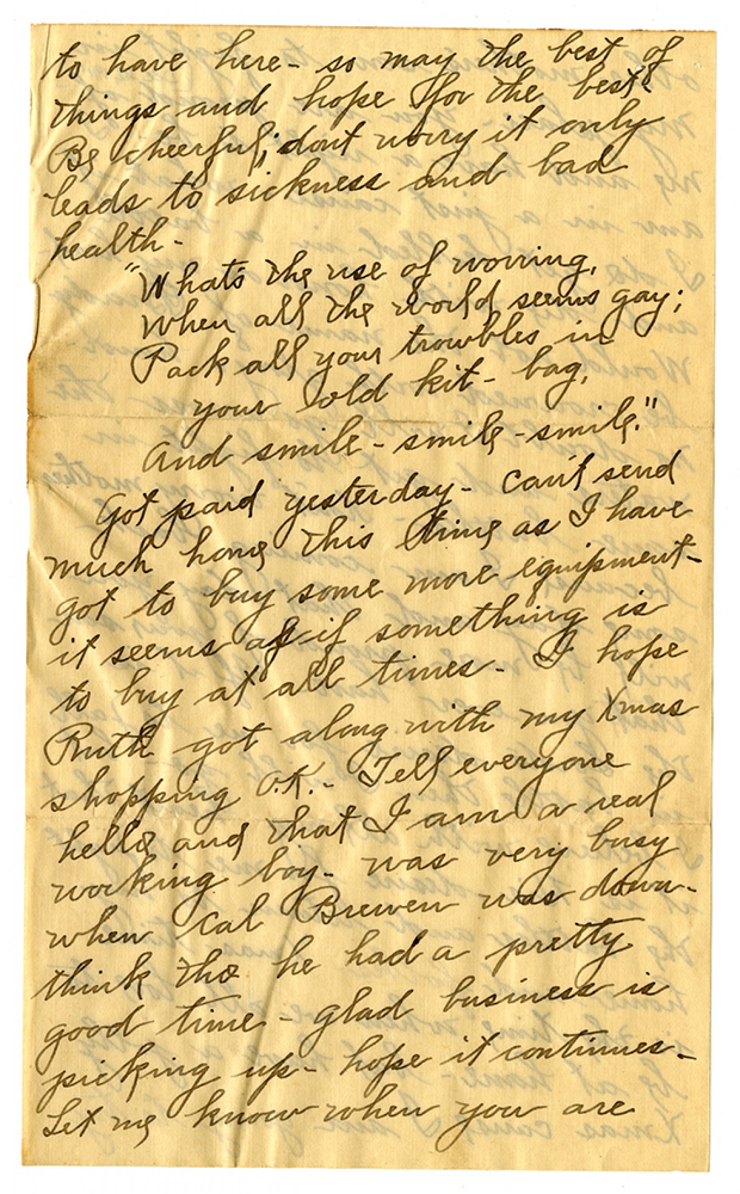 to have here - so may the best of things and hope for the best Be cheerful; dont worry it only leads to sickness and bad health. "What's the use of worring, When all the world seems gay; Pack all your troubles in your old kit - bag, And smile - smile - smile." Got paid yesterday - Can't send much home this time as I have got to buy some more equipment - it seeems as if something is to buy at all times. I hope Ruth got along with my Xmas shopping O.K. Tell everyone hello and that I am a real working boy. Was very busy when Cal Brewer was down - think tho he had a pretty good time - glad business is picking up - hope it continues - Let me know when you are