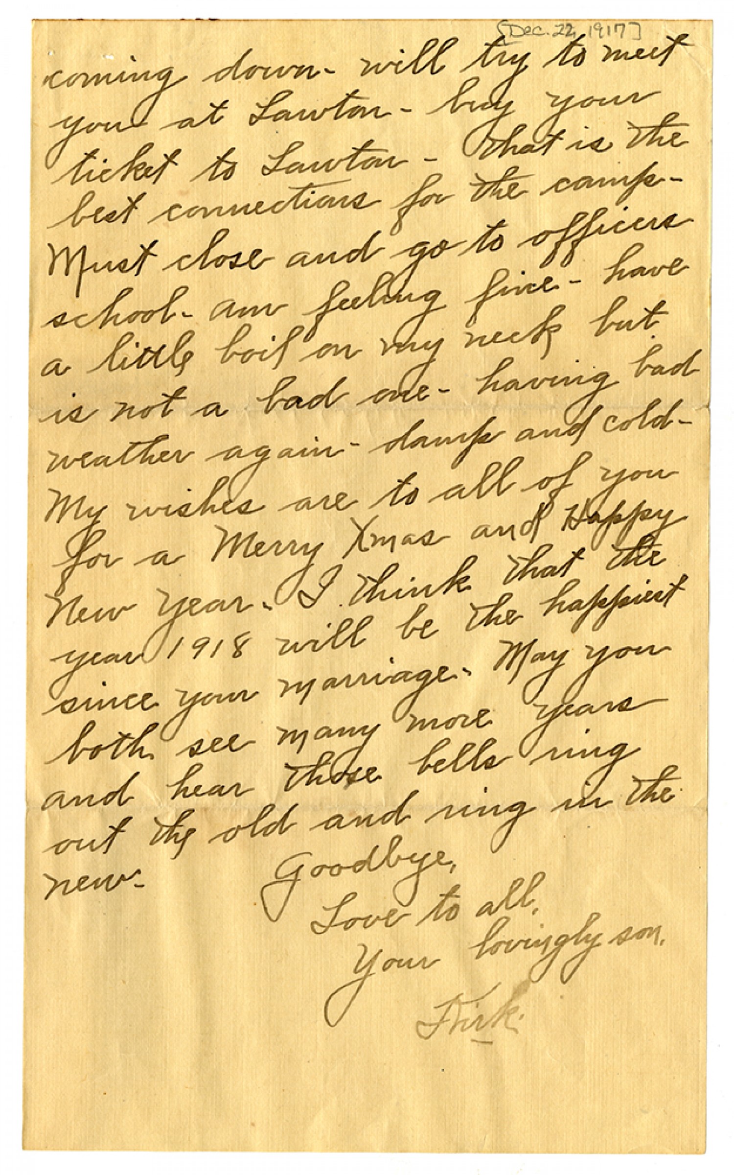 coming down - will try to meet you at Lawton - buy your ticket to Lawton - that is the best connections for the camp - Must close and go to the officers school. am feeling fine - have a little boil on my neck but is not a bad one - having bad weather again - damp and cold - My wishes are to all of you for a Merry Xmas and Happy New Year. I think that the year 1918 will be the happiest since your marriage. May you both see many more years and hear those bells ring out the old and ring in the new. Goodbye, Love to all, Your lovingly son, Kirk.