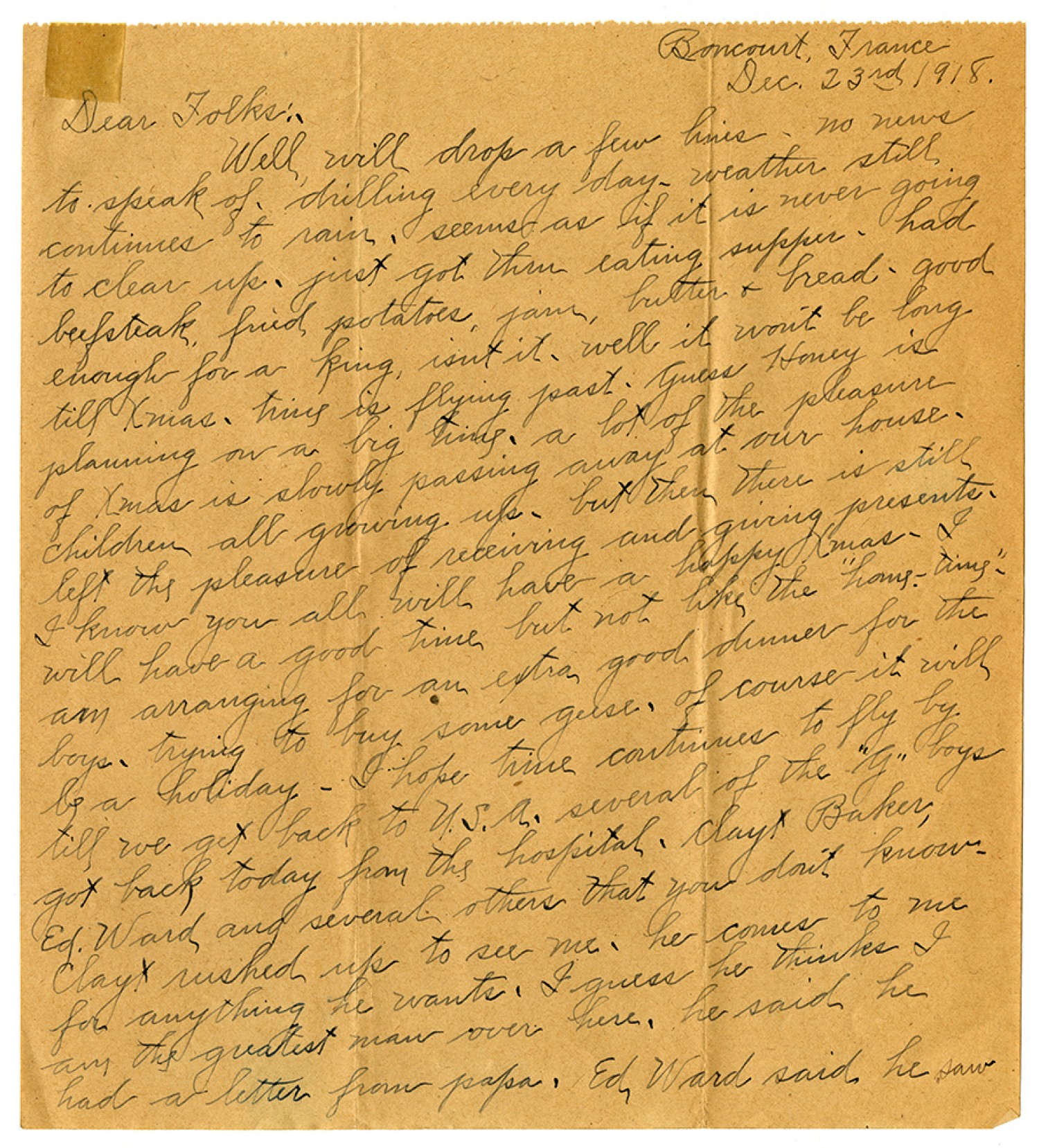 Boncourt, France [December] 23 1918. Dear Folks:- Well will drop a few lines - no news to speak of - drilling every day- weather still continues to rain - seems as if it is never going to clear up - just got thru eating supper - had beefsteak, fried potatoes, jam, butter & bread - good enough for a king, isnt it - well won't be long till Xmas - time is flying past - Guess HOney is planning on a big time - a lot of the pleasure of Xmas is slowly passing away at our house - children all growing up - but then there is still left the pleasure of receiving and giving presents - I know you all will have a happy Xmas - I will have a good time but not like the "home-time" - am arranging for an extra good dinner for the boys - trying to buy some geese, of course it will be a holiday - I hope time continues to fly by till we get back to U.S.A. several of the "G" boys got back today from the hospital - Clay Baker, Ed. Ward and several others that you don't know - Clay rushed up to see me - he comes to me for anything he wants - I guess he thinks I am the greatest man over here, he said he had a letter from papa, Ed Ward said he saw