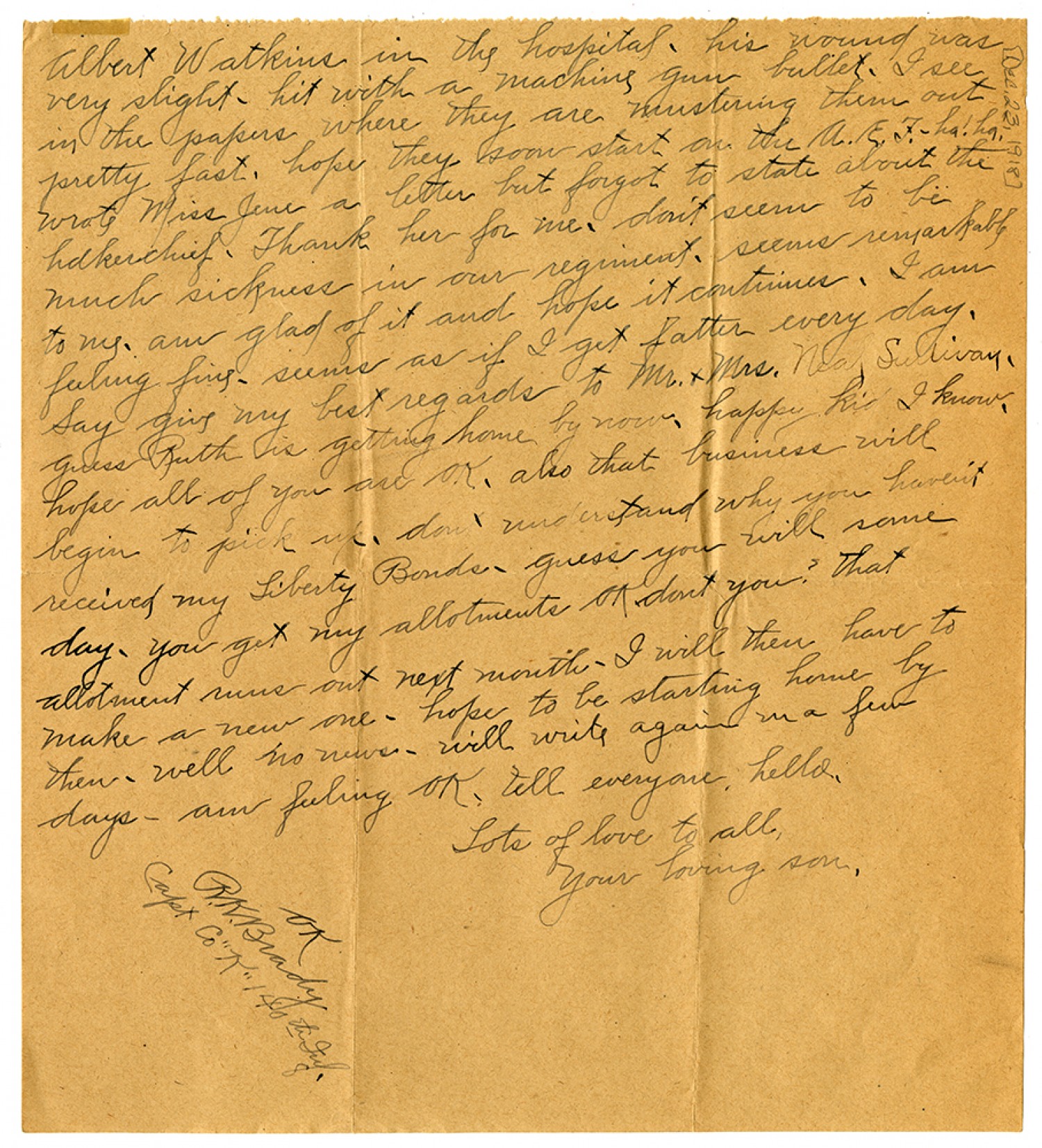 Albert Watkins in the hospital - his wound was very slight - hit with a machine gun bullet - I see in the papers where they are mustering them out pretty fast. hope htey soon start on the A.E.F. - ha! ha! ha. wrote Miss June a letter but forgot to state about the handkerchief - Thank her for me - don't seem to be much sickness in our regiment - seems remarkable to me - am glad of it and hope it continues - I am feeling fine - seems as if I get fatter every day - Say give my best regards to Mr. & Mrs. Neal Sullivan, guess Ruth is getting home by now - happy kid I know, hope all of you are OK, also that business will begin to pick up - don't understand why you haven't received my Liberty Bonds - guess you will some day- you get my allotments OK dont you? that allotment runs out next month - I will then have to make a new one - hope to be starting home by then - well no news - will write again in a few days - am feeling OK - tell everyone, hello, Lots of love to all, Your loving son. OK R.K.Brady Capt Co "K" 140th Inf.