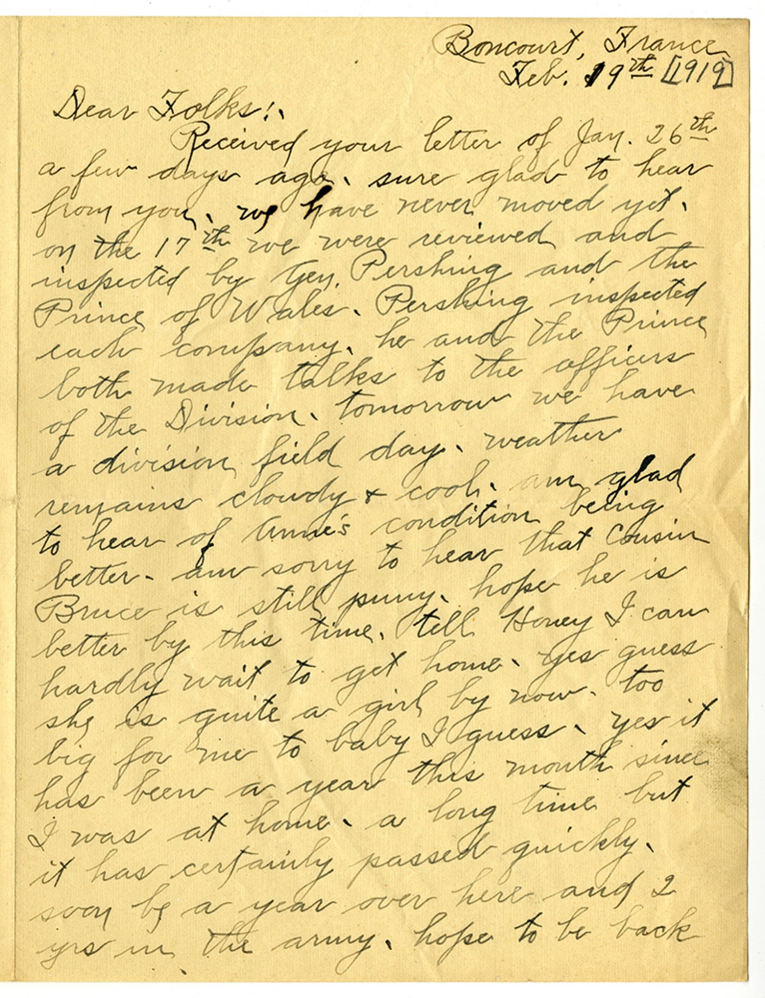 Boncourt, France [February 19, 1919] Dear Folks:- Received your letter of [January] 26th a few days ago - sure glad to hear from you - we have never moved yet - on the 17th we were reviewed and inspected by Gen. Pershing and the Prince of Wales - Pershing inspected each company - he and the Prince both made talks to the officers of the Division - tomorrow we have a division field day - weather remains cloudy and cool - am glad to hear of Anne's condition being better - am sorry to hear that cousin Bruce is still [MS illegible: 1 wd] - hope he is bette rby this time - tell Honey I can hardly wait to get home - yes gues sshe is quite a girl by now - too big for me to baby I guess -yes it has been a year this month since I was at home - a long time but it has certainly passed quickly - soon be a year over here and 2 yrs in the army - hope to be back