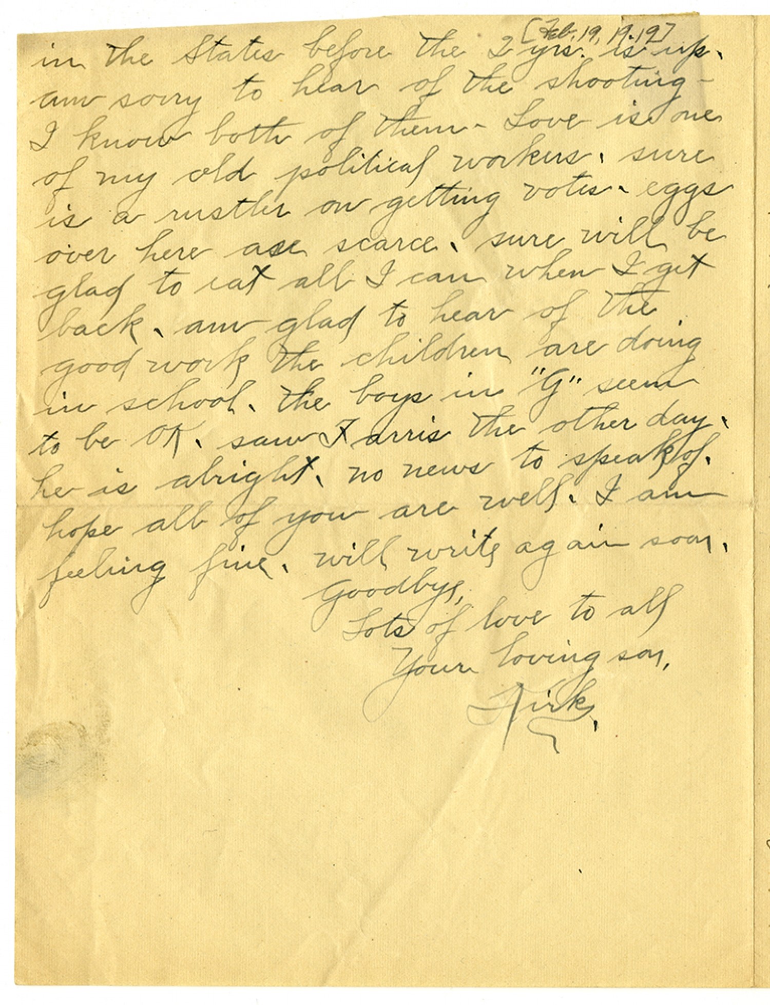 in the States before the 2 yrs. is up - am sorry to hear of the shooting - I know both of them -Love is one of my old political workers, sur eis a rustler on getting votes - eggs over here are scarce - sure will be glad to eat all I can when I get back - am glad to hear of the good work the children are doing in school - the boys in "G" seem to be OK - saw Farris the other day - he is alright - no news to speak of - hope all of you are well - I am feeling fine - will write again soon, Goodbye, Lots of love to all Your loving son, Kirk,