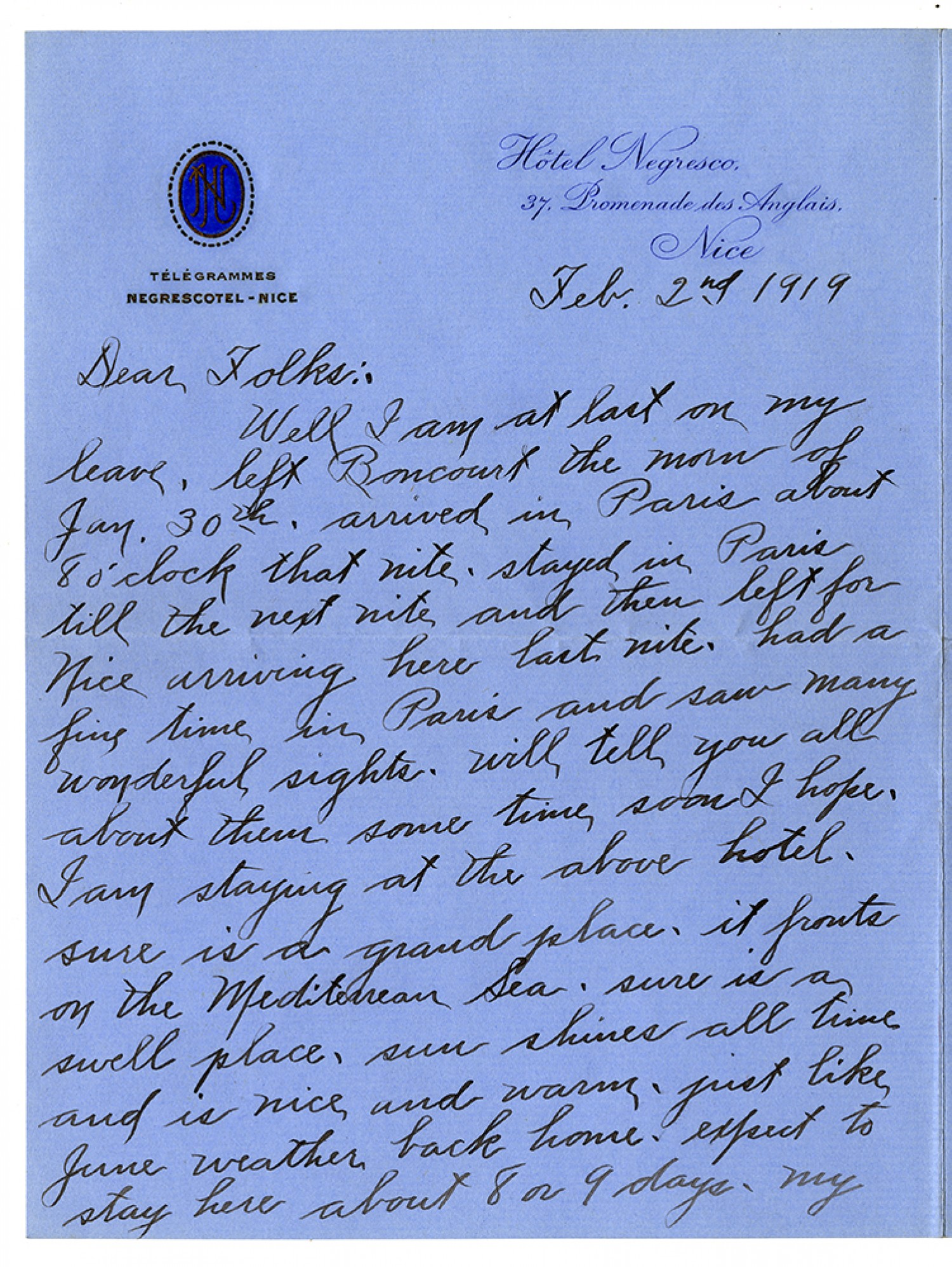 [Hotel Negresco letterhead] [February] 2nd, 1919 Dear Folks:- Well I am at last on my leave, left Boncourt hte morn of [January] 30th, arrived in Paris about 8 o'clock that nite - stayed in Paris till the next nite and then left for Nice arriving here last nite - had a fine time in Paris and saw many wonderful sights - will tell you all about them some time soon I hope, I am staying at the above hotel - sure is a grand place - it fronts on the Mediterrean Sea. sure is a swell place, sun shines all time and is nice and warm - just like June weather back home - expect to stay here about 8 or 9 days - my