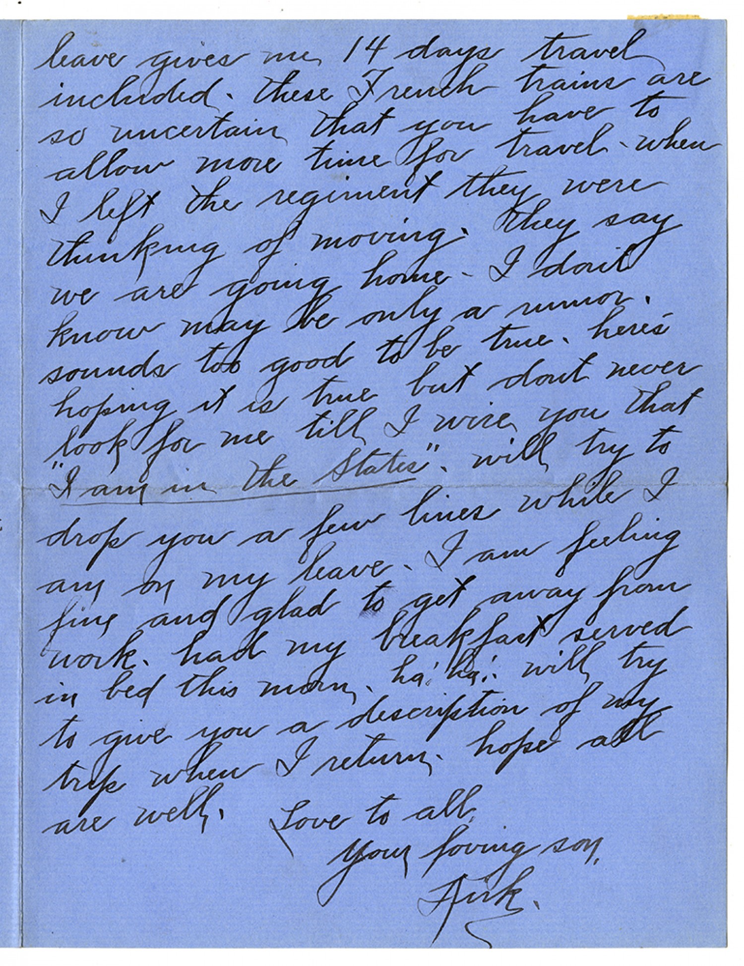 leave gives me 14 days travel included - these French trains are so uncertain that you have to allow mor etime for travel - when I left the regiment they were thinking of moving - they say we are going home - I don't know may be only a rumor - sounds too good to be true - here's hoping it is true but dont neve rlook for me till I wire you that "I am in the States" - will try to drop you a few lines while I am on my leave - I am feeling fine and glad to get away from work - had my breakfast served in bed this morn - ha! ha! will try to give you a description of my trip when I return - hope all are well, Love to all, Your loving son, Kirk.