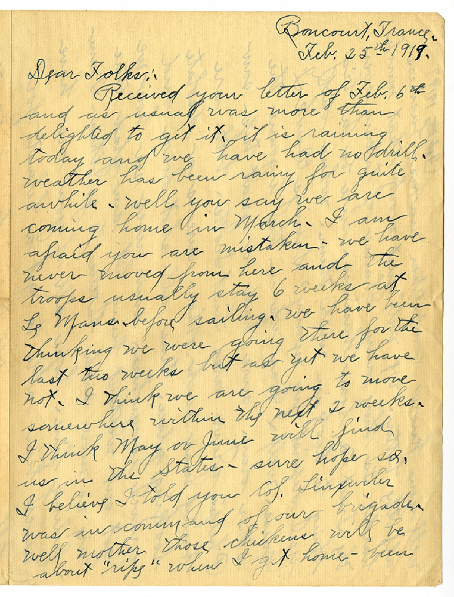 Boncourt, France - [February] 25th 1919 - Dear Folks:- Received your letter of [February] 6th and as usual was more than delighted to get it - it is raining today and we have had no drill - weather has been rainy for quite awhile - well yo usay we are coming home in March - I am afraid you are mistaken - we have never moved from here and the troops usually stay 6 weeks at Le Mans before sailing - we have been thinking we were going there for the last two weeks but as yet we have not - I think we are going to move somewhere within the next 2 weeks I think May or June will find us in the States - sure hope so, I believe I told you Col. Linxwiler was in command of our brigade - well mother those chickens will be about "ripe" when I get home - been